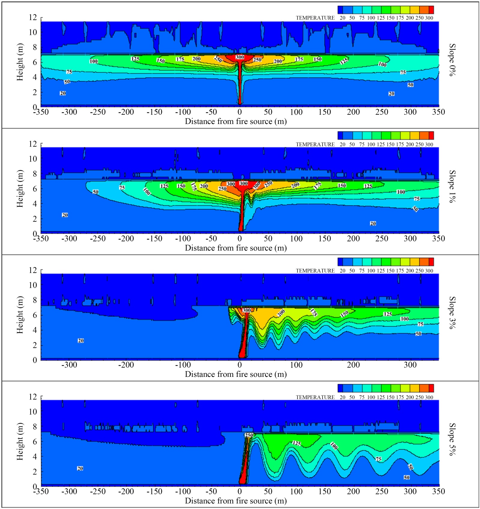 (a) 50 MW水平隧道排烟口对称布置 (b) 1%倾斜隧道排烟口非对称布置