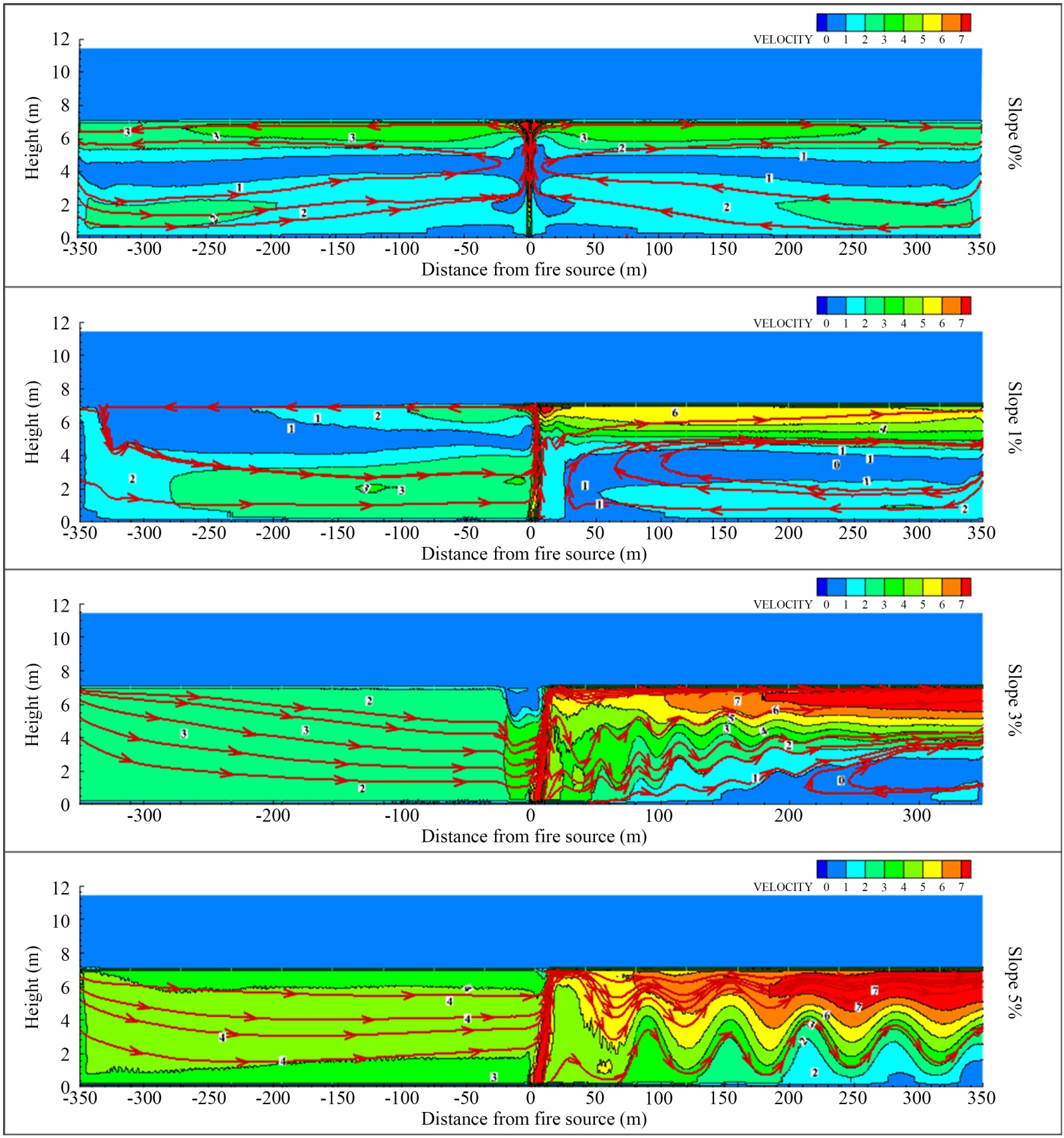 倾斜隧道工况下,热浮力与烟囱效应形成耦合作用,随着隧道坡度的增加,烟囱效应增强,增强了上游诱导气流的速度,烟气逆流长度变短。同时增强的烟囱效应加剧了下游烟气的对流换热,上层烟气与下层冷空气混合更强,进而导致下游烟气层厚度增加[15],尤其是对于5%倾斜隧道,彻底破坏流场对称性。高温烟气在烟囱效应的驱动下,呈现明显的上坡方向偏转趋势,火源上游侧几乎无有效烟气。速度场方面,下游侧烟气流速较0%坡度工况显著增强,且远高于上游侧,下游侧出现明显的波浪状流速起伏,如图4所示。