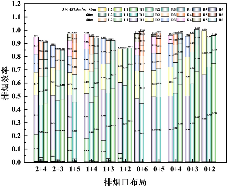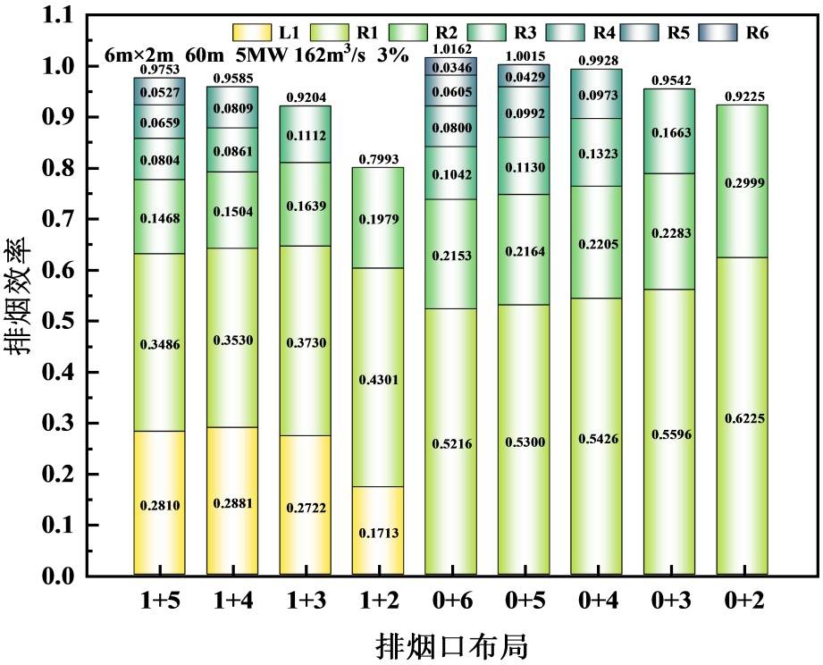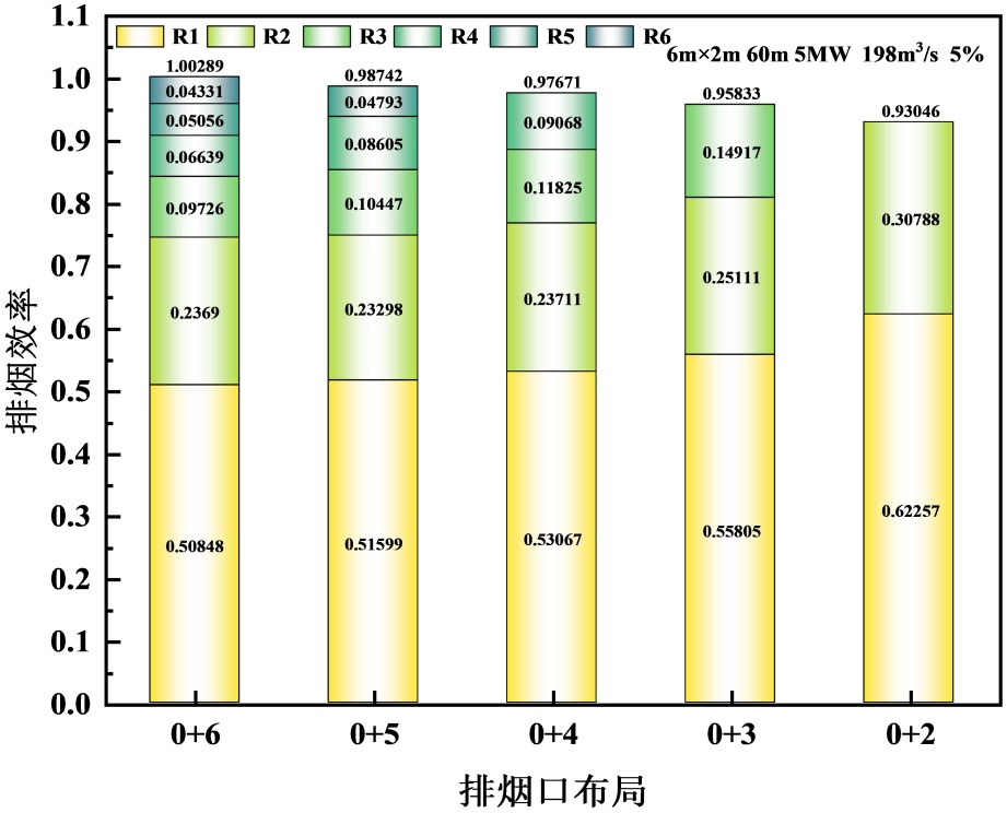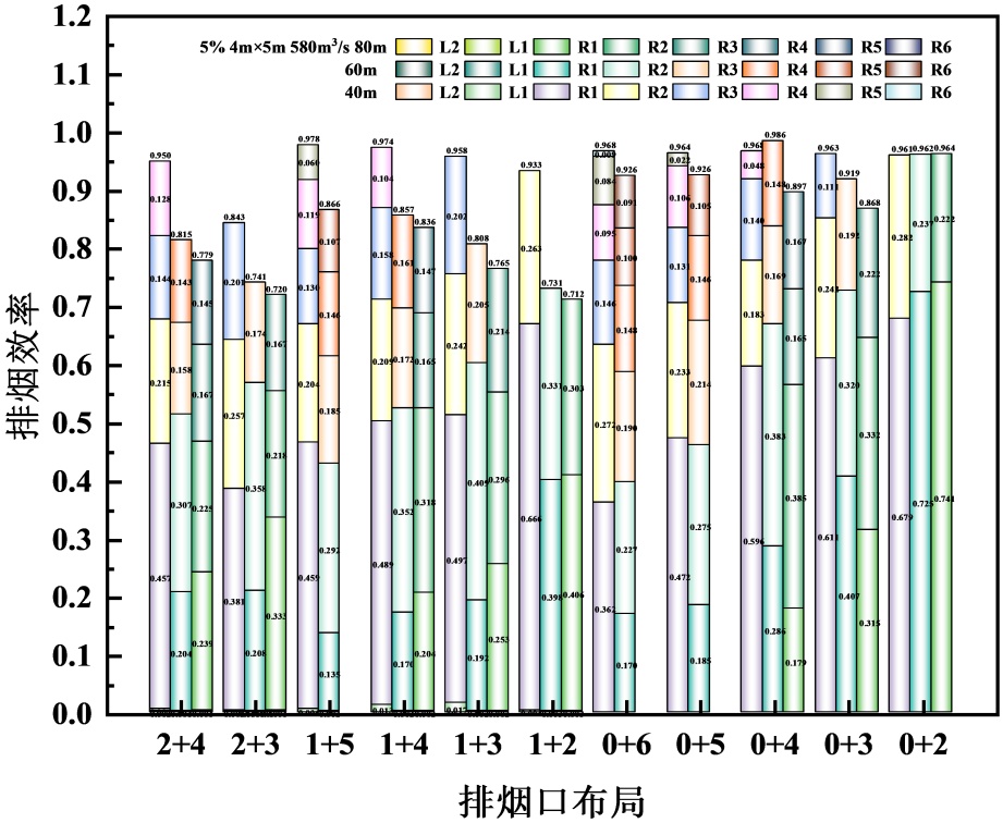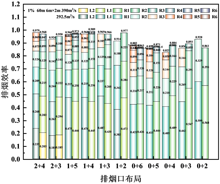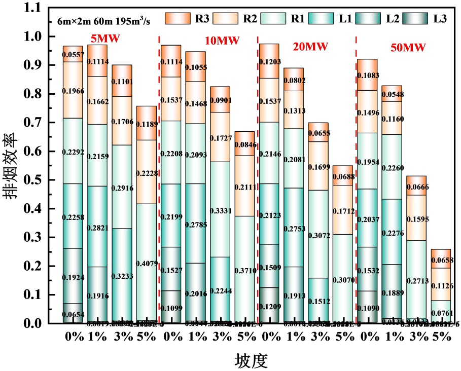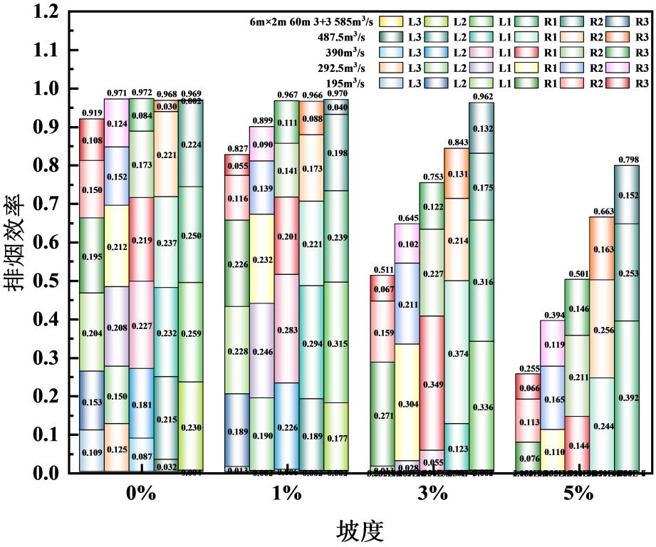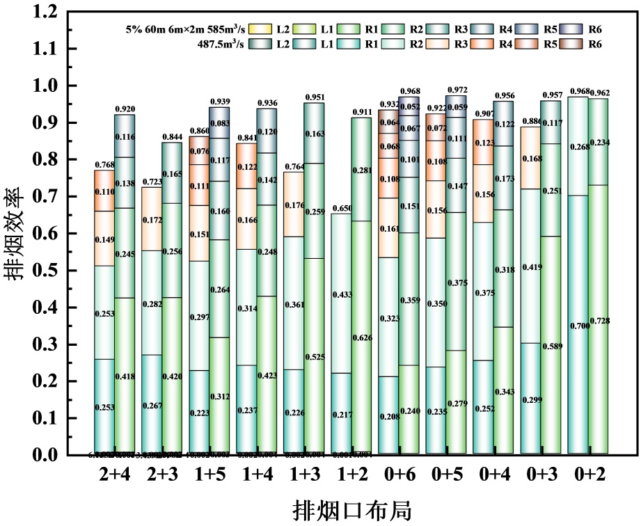 1%倾斜隧道排烟口布置为“2+”“1+”的排烟效率较“0+”的高,而3%、5%倾斜隧道则相反。主要是因为,坡度 < 3%时,烟气受烟囱效应较小,烟气层较稳定,上游烟气蔓延距离相对较长,上下游排烟口分散布置可以覆盖更长距离的烟气,从而捕获更多的烟气;而坡度 ≥ 3%时,受热浮力和烟囱效应影响,烟气可以快速集中在火源下游,上游烟气蔓延距离短,上游排烟口“失效”。例如:在各种排烟口布置情况下,1%倾斜隧道,对R5、R6排烟口的利用率不高,排烟效率近似为0;3%倾斜隧道,对L2、L1排烟口的利用率不高,排烟效率近似为0。因此,建议1%倾斜隧道,排烟口上下游非对称布置,且下游排烟口个数不宜超过4个,3%、5%倾斜隧道,排烟口布置在火源下游,且下游排烟口个数不宜超过4个。