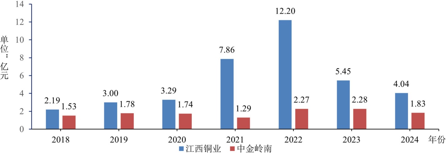 本文借鉴王科唯等[5]等学者的研究,从绿色研发投入和绿色研发成果两方面度量企业绿色创新。绿色创新投入方面,现有文献主要从研发资金投入和研发人员投入两个维度选取评价指标[6]。绿色研发投入金额能够客观具体地反映企业用于绿色创新技术研发的资金规模,研发投入强度则通过相对数消除规模差异。研发人员投入强调绿色研发团队的规模与质量,包括绿色研发人员数量统计和占比。绿色研发成果方面,本文借鉴明雷等[7]的研究以绿色专利授权数和发明专利数代表企业绿色发展水平。综合考虑公司绿色创新历史与内外环境变化,本文选择2018~2024年为研究期间,从投入、成果两方面对江西铜业绿色创新情况展开分析。考虑到有色金属企业业务结构、污染物排放特征及环保政策压力等因素,本文选择中金岭南作为对比公司,分析江西铜业绿色创新情况。