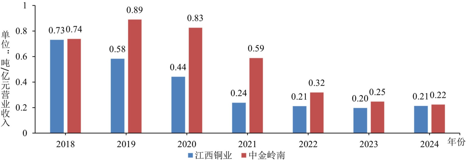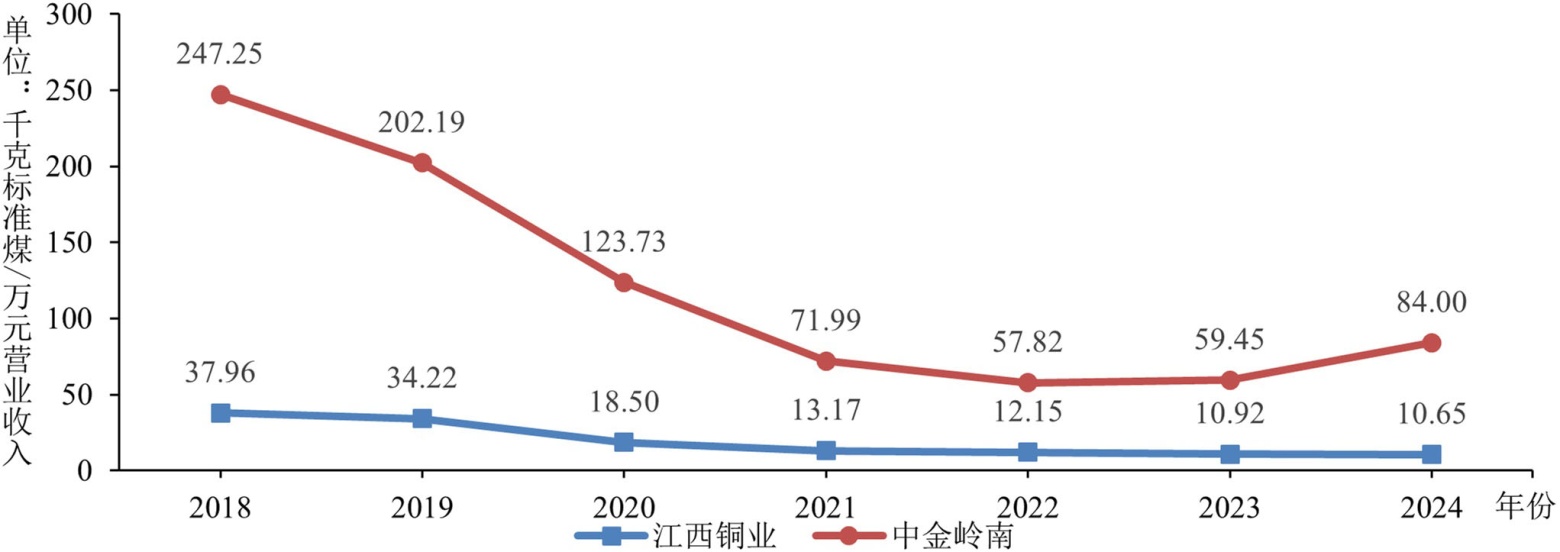 如图2所示,江西铜业绿色创新使得能源消耗密度大幅下降。2018~2024年,江西铜业能源消耗密度始终低于中金岭南。2018~2021年,江西铜业能源消耗密度持续下降,到2021年已降至13.17千克标准煤/万元营业收入,降幅达65.31%,能源成本水平的大幅度改善,主要得益于公司不断引进新技术、改进生产流程,说明公司绿色创新取得一定成效。2022~2024年,该数值持续下降,但降幅趋缓。此外,随着能耗降低,江西铜业能源动力成本占营业收入比重亦大幅下降,江西铜业节能降耗成果显著。
