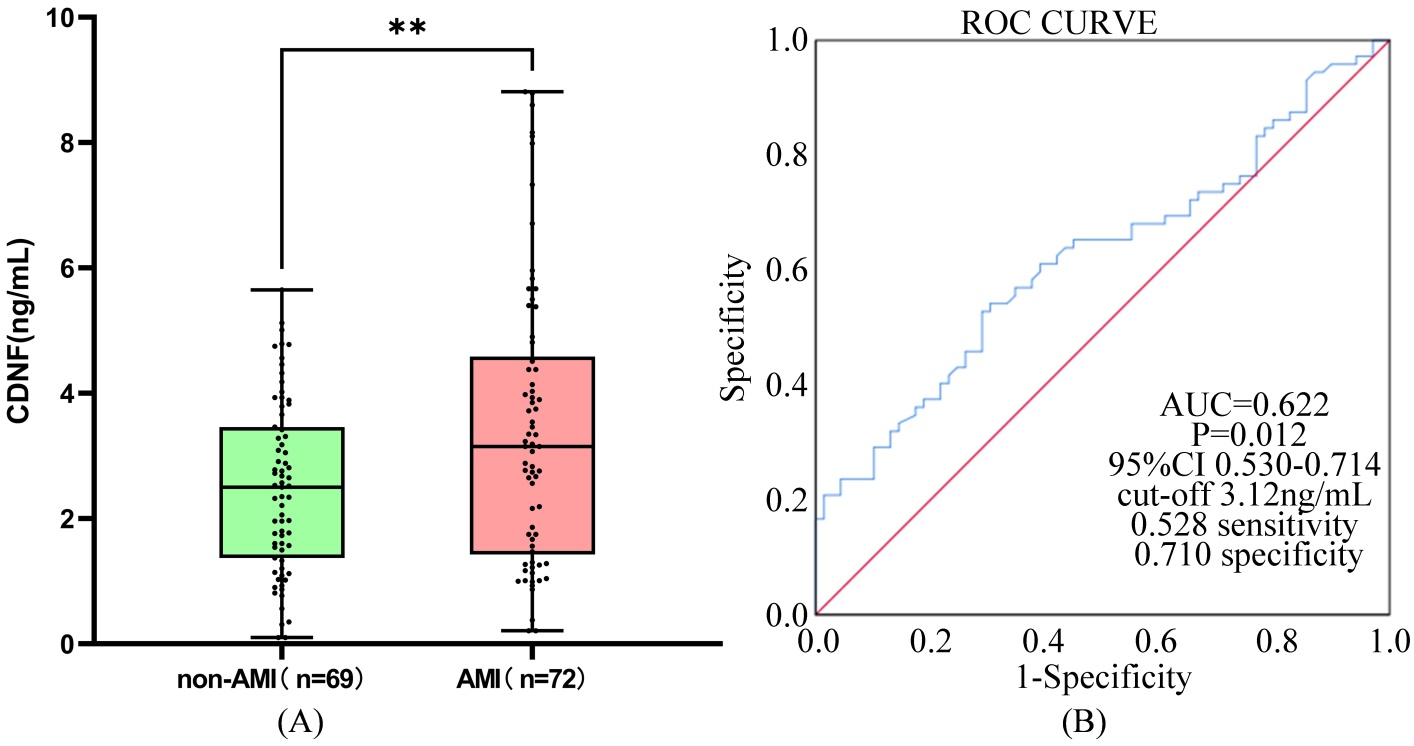 收集患者的一般资料包括年龄、性别、血压、心率、吸烟史、饮酒史、高血压病史及糖尿病病史,以及患者的临床实验室指标包括:尿素(Ureophil, URE)、肌酐(creatinine, Cr)、丙氨酸氨基转移酶(Alanine Transferase, ALT)、总胆固醇(Total Cholesterol, TC)、白蛋白(Albumin, ALB)、甘油三酯(triglycerides, TG)、低密度脂蛋白胆固醇(low-density lipoprotein cholesterol, LDL-C)、高密度脂蛋白胆固醇(high-density lipoprotein cholesterol, HDL-C)、脂蛋白a (lipoprotein (a), Lp (a))、同型半胱氨酸(homocysteine, HCY)、高敏肌钙蛋白I (high-sensitivity troponin I, hs-TnI)、肌酸激酶同工酶MB (Creatine Kinase-MB, CK-MB)、肌红蛋白(Myoglobin, MYO)、B型脑钠肽(B-type natriuretic peptide, BNP)、D二聚体(D-dimer, D-D)、纤维蛋白原(fibrinogen, FIB)等指标。所有患者采用促凝管收集入院时静脉血样本。AMI组患者继续采集入院24小时和96小时的静脉血,通过酶联免疫吸附试验(enzyme-linked immunosorbent assay, ELISA)测量并计算血清CDNF水平。