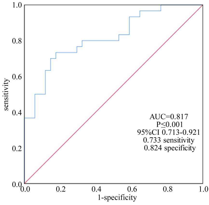 统计患者6月内发生重点事件或随访结束时复查的心脏超声和实验室检验指标,包括左心室射血分数(Left Ventricular ejection fraction, LVEF),E/e’,左心房直径(Left Atrium diameter, LAd),左心室直径(Left Ventricular diameter, LVd),右心室直径(Right Ventricular diameter, RVd),以及实验室检测指标URE、Cr、ALT、TC、ALB、TG、LDL-C、HDL-C、Lp (a)、HCY。按预后不良组和正常组进行对比分析,存在差异的因素包括LAd、RVd (表5)。将CDNF24 h和CDNF96 h与这些因素进行二元Logistic回归分析(采用向前逐步法),最终保留2个独立影响的变量分别是LAd和CDNF24 h (表6),以该回归模型进行ROC曲线分析,模型的AUC为0.817 (P < 0.01),代表该模型有良好的预后评价效能(图10)。