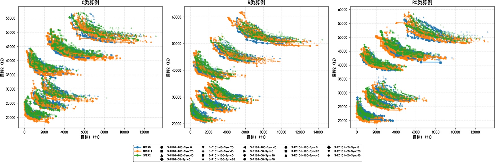 图1. 各个算法在C类、R类、RC类算例中获得的Pareto前沿对比图