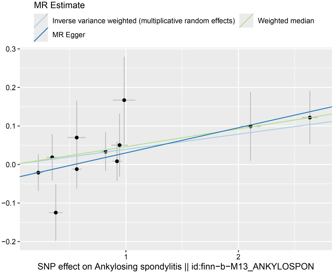 Figure 1. MR scatter plot for ankylosing spondylitis and kidney cancer (except renal pelvis)