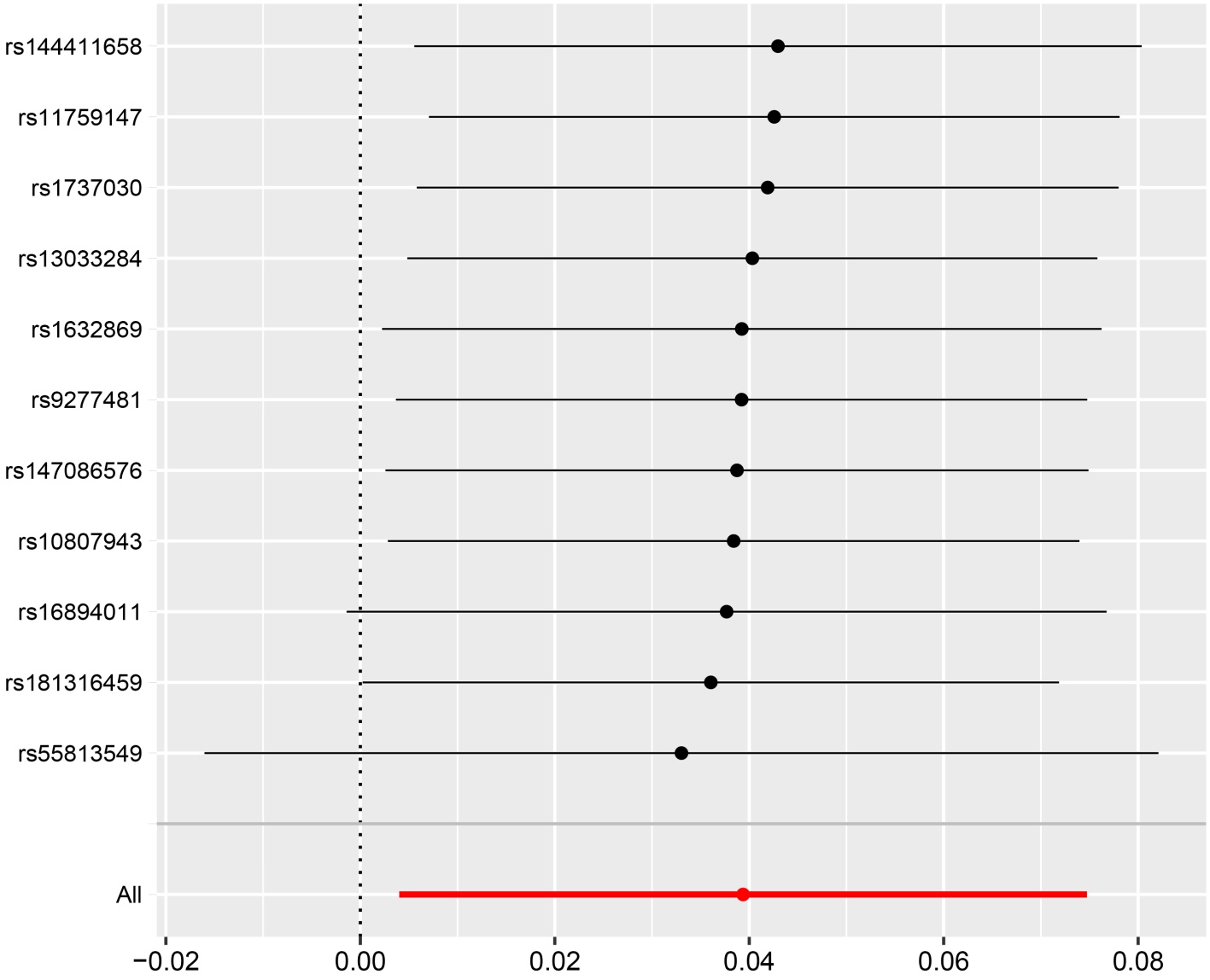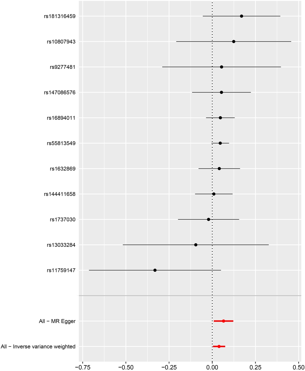图2. 遗单个SNP孟德尔随机化效应估计的森林图(强直性脊柱炎→肾恶性肿瘤(不含肾盂))
