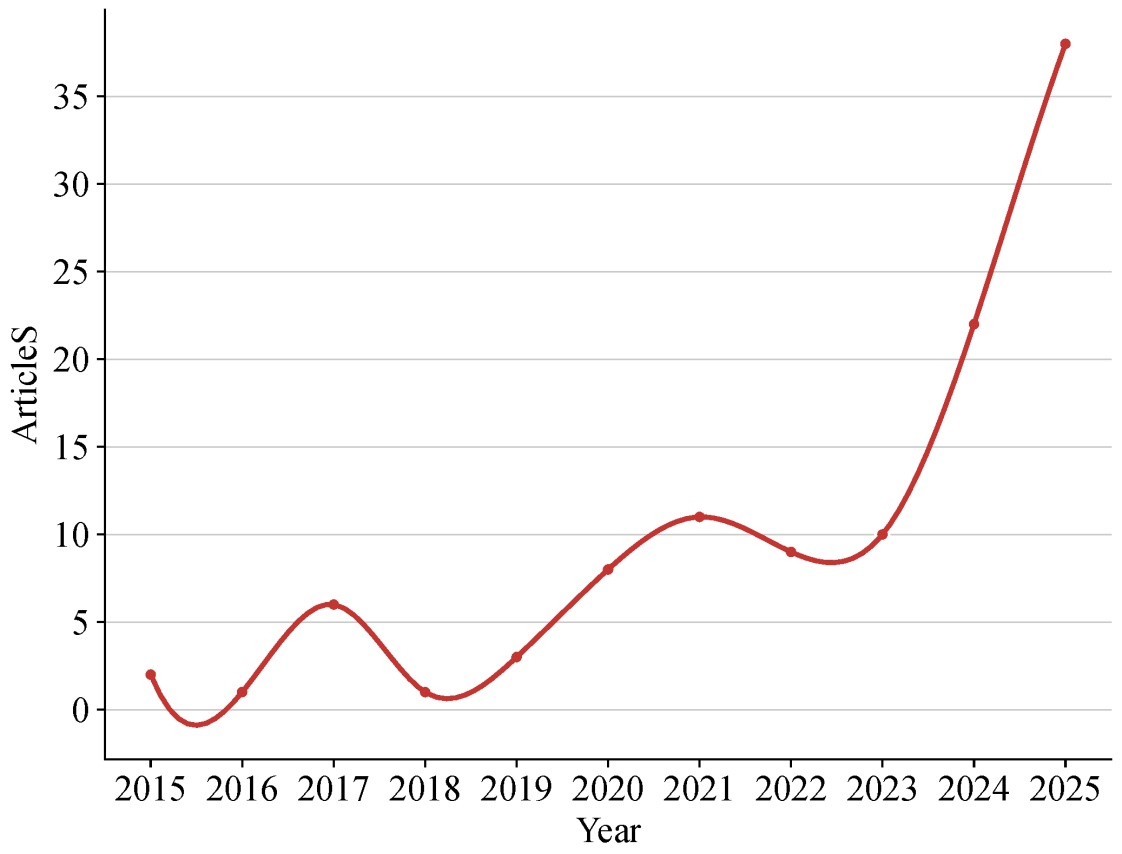 对纳入文献分析,统计年发文量(图1)。2015年至2025年间,抑郁症和脑胶质淋巴系统相关文献的年度发表文献数量的变化趋势:自2015年的2篇文献起,每年的发表量总体呈增加趋势,在2023年发文量增加较为迅速,到2025年已增至38篇。这得出,该领域虽然仍较为小众,但受学术界的关注度逐渐增加,未来非常可能成为抑郁症研究中的又一热点。