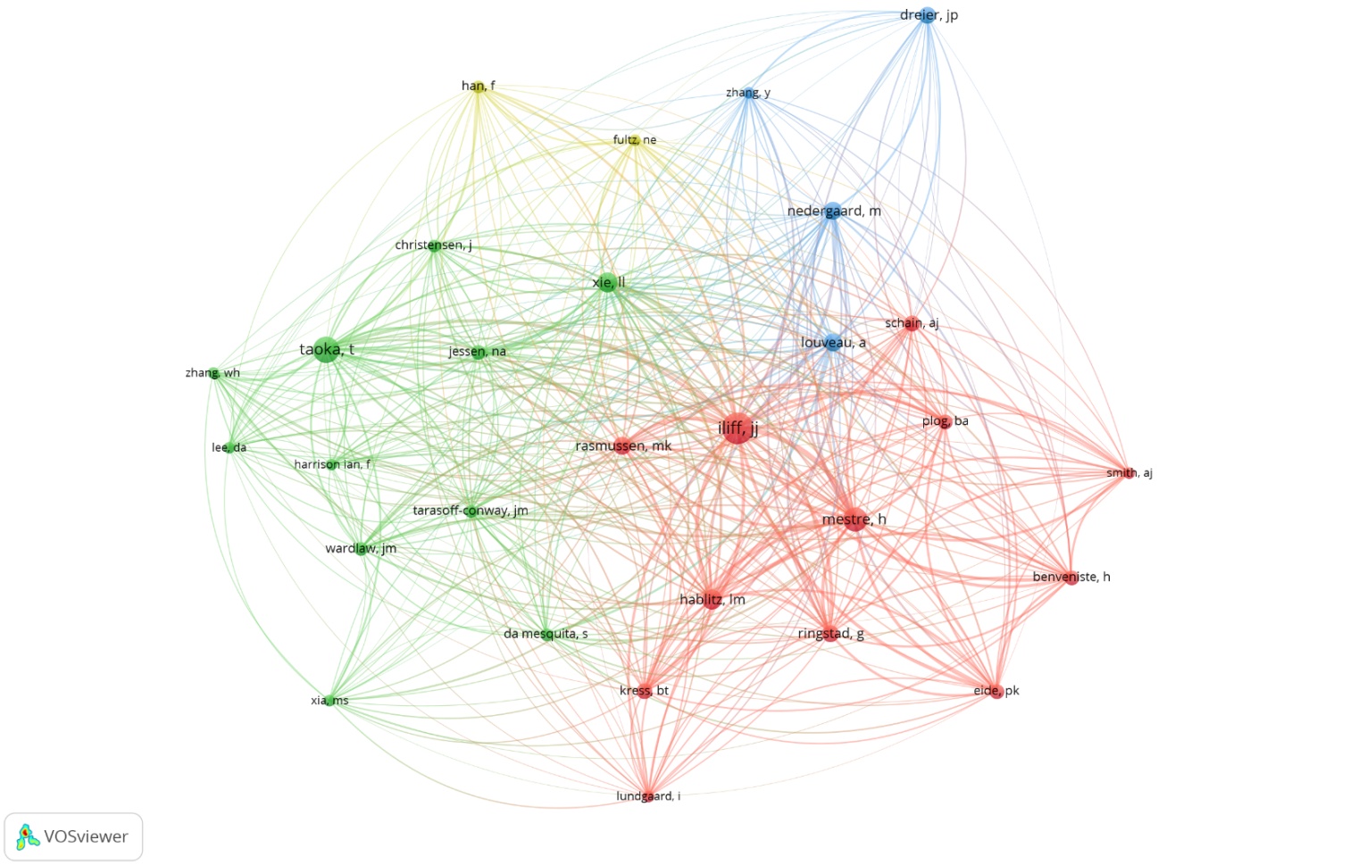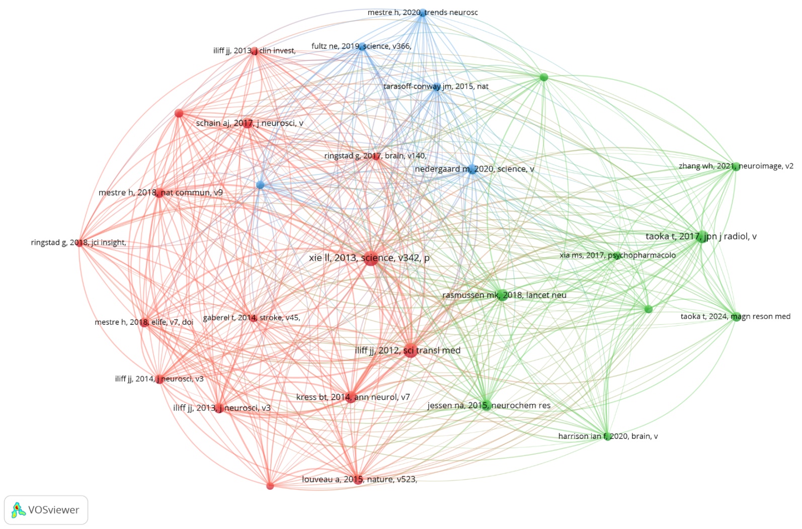 对纳入文献进行共被引作者分析(图6)。结果显示,该领域呈现多核心模块化的学术格局,各模块间存在活跃的跨模块连接,尤其Iliff JJ与Nedergaard M等关键节点在不同研究方向间发挥了学术桥梁作用,整体反映出该领域“核心引领、多向并行、交叉融合”的发展特征。