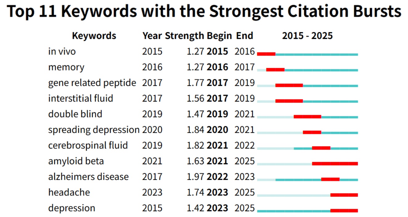 突显度较高前11位分析(图8),结果显示,该领域的研究热点随时间呈现动态演化特征:早期(2015~2019年)突现关键词以基础研究为主,包括in vivo、memory、gene related peptide和interstitial fluid;2020~2022年,spreading depression、cerebrospinal fluid和alzheimer’s disease等关键词相继出现,反映研究向胶质淋巴系统病理机制及神经退行性疾病关联的聚焦;而2023~2025年,amyloid beta、headache和depression成为最新突现的高影响力关键词,其中depression虽于2015年首次出现,但在近年重新成为研究热点,提示该领域正从基础机制探索转向神经精神疾病的临床关联研究,且核心热点的持续时间与突现强度呈上升趋势,反映出研究关注度的逐步聚焦与深化。