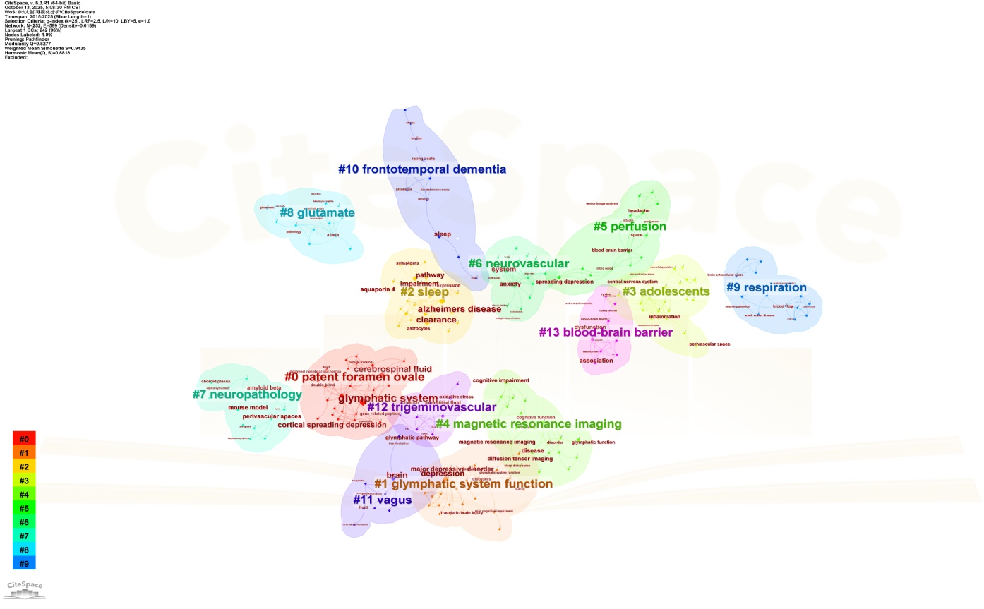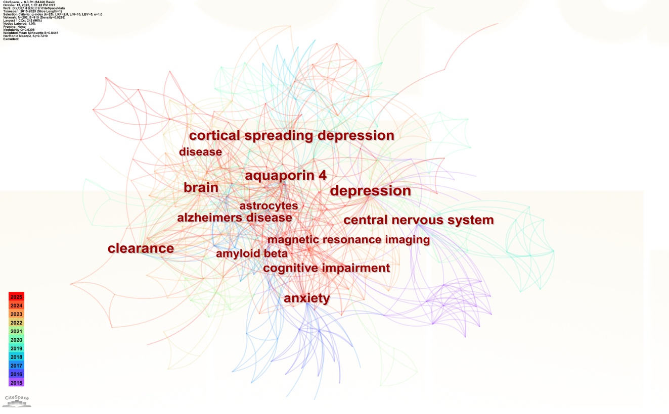 关键词共现时间图谱(图9)显示,研究热点呈现出明显的时间演化与主题聚合特征:以水通道蛋白4 (aquaporin 4)、星形胶质细胞(astrocytes)、皮层扩散性抑制(cortical spreading depression)为代表的基础机制研究(红色节点,2023~2025年)是当前最新且最核心的研究方向;阿尔茨海默病(alzheimer’s disease)、抑郁症(depression)、β淀粉样蛋白(amyloid beta)等临床关联主题(红色/橙色节点)与脑代谢清除(clearance)、认知障碍(cognitive impairment)等功能研究持续活跃;而磁共振成像(magnetic resonance imaging)、中枢神经系统(central nervous system)等技术与系统层面的关键词(紫色/蓝色节点)则代表了早期(2015~2020年)的研究基础,整体网络反映出该领域从基础机制探索到临床疾病关联、再到功能评估的递进式发展脉络。