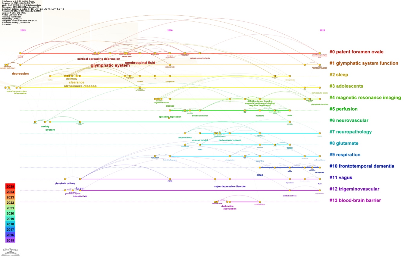 关键词聚类时间线图谱(图11)显示,抑郁症领域下脑胶质淋巴系统相关文献研究热点的动态演化轨迹:早期(2015~2020年)以脑代谢清除(clearance)、间质液(interstitial fluid)及基础机制探索为核心;2020~2023年,研究逐步聚焦于皮层扩散性抑制(cortical spreading depression)、β淀粉样蛋白(amyloid beta)与阿尔茨海默病(alzheimer’s disease)的病理关联,并引入磁共振成像(magnetic resonance imaging)等技术手段;2023~2025年,胶质淋巴系统功能(glymphatic system function)、抑郁症(depression)及偏头痛(migraine headache)成为最新研究前沿,同时扩散张量成像(diffusion tensor imaging)等临床技术的应用显著增加,整体演化路径反映出该领域从基础机制向神经精神疾病临床转化的递进式发展特征。