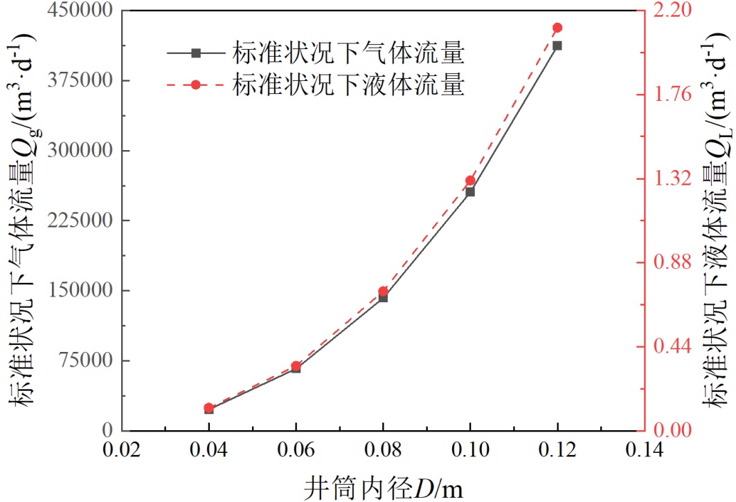 将其他边界条件设置为基准工况,改变井筒内径D,分析井筒内径对井筒产能和整个井筒中的平均液滴直径的影响。