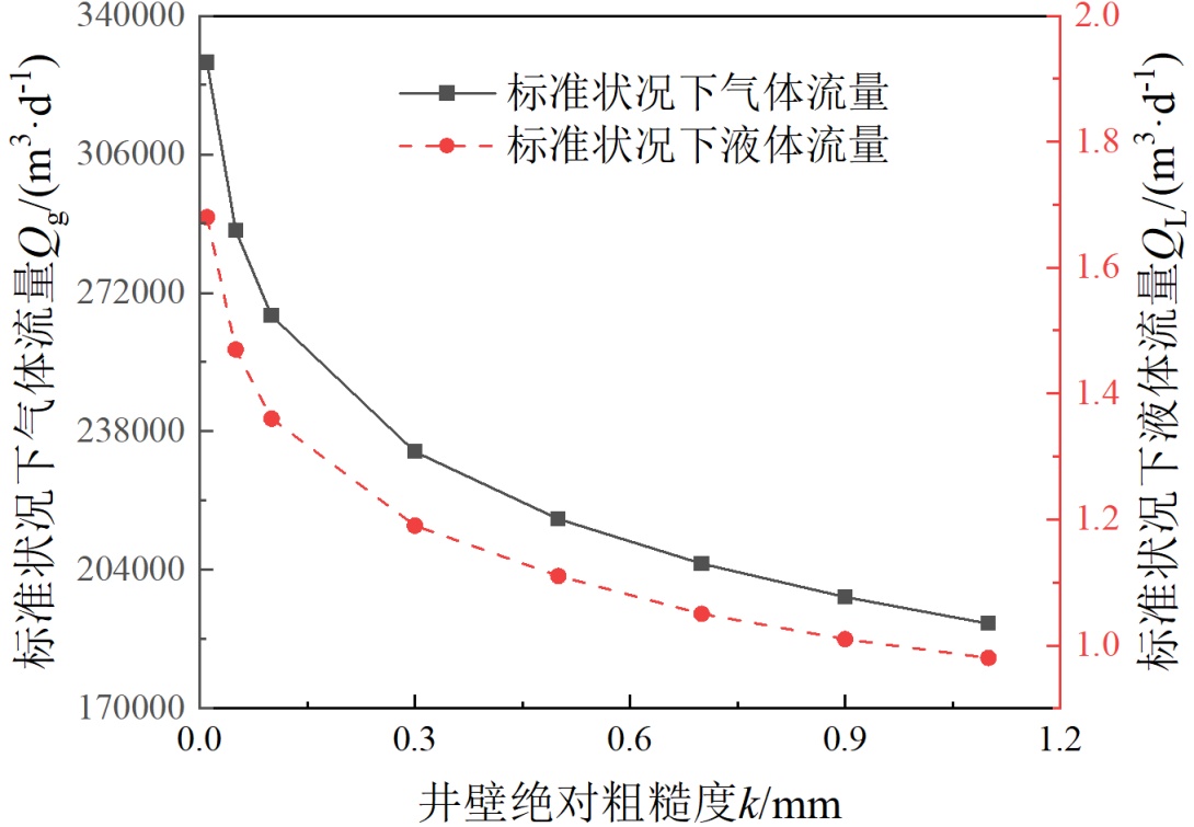 宏观产能分析:如图5所示,随着粗糙度的增加,产液产气量逐渐减小,且在低粗糙度区间下降较快,随后趋于平缓。粗糙度的增加直接提高了Colebrook摩擦系数,导致沿程阻力损失增加。为维持井底到井口的压力平衡,气井只能通过降低产量来减少摩阻损失,达到新的平衡。