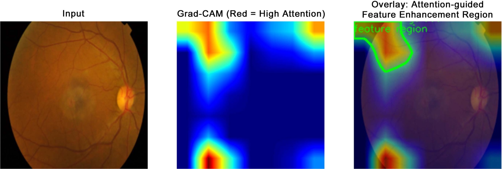 3) 为验证CBAM模块的特征聚焦效果,采用Grad-CAM热力图可视化分析,结果如图1所示。可见引入CBAM后,模型注意力区域(红色高亮部分)从背景组织转移至微动脉瘤、出血点等关键病灶区域,证明该模块能有效引导模型关注诊断相关特征。