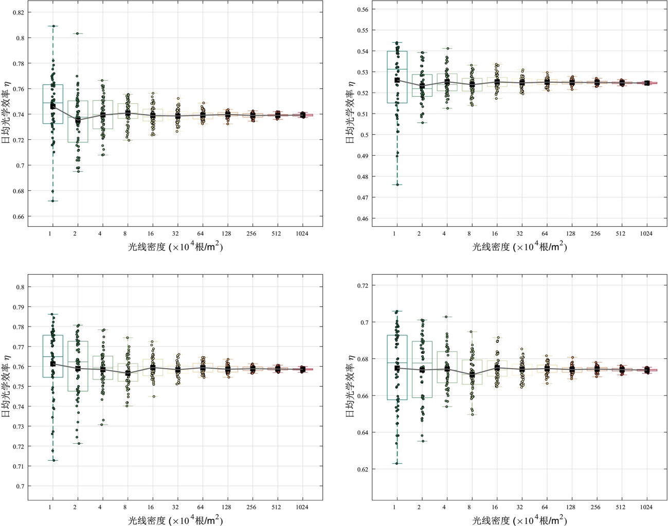 为了研究蒙特卡洛光线追踪的随机性,我们对每个方案进行了50次重复实验,并记录了相应的日均光学效率。图7展示了定日镜的仿真结果随光线追踪密度的变化散点图,并叠加了箱线图标记的统计值,折线图表示每个方案计算的光学效率均值。在光线密度较小时,每次实验的计算结果波动较大,随着光线密度增加,计算结果逐渐收敛,当光线密度达到1024 × 104根/m2时,50次计算结果基本一致。尽管蒙特卡洛本身存在随机性,但在一定数量的光线密度下,结果表现出良好的收敛性。因此,该方法可以被视为定日镜场应用中模拟光学效率的一种基准方法。