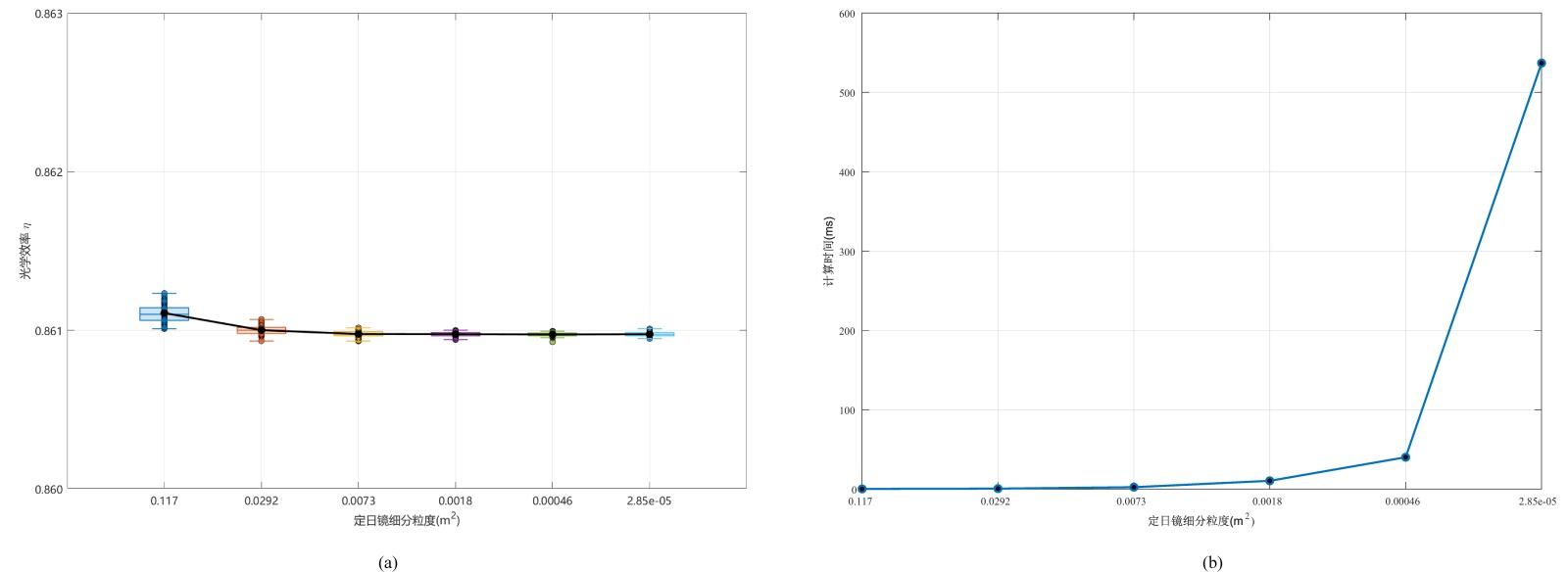 图9. 定日镜细分粒度对光学效率及计算时间的影响。(a) 中散点表示各细分粒度下50次独立重复实验计算结果,箱线图反映数据分布特征(中位数、四分位范围及极值),折线图表示对应的平均光学效率;(b) 中每个数据点表示相应细分粒度下50次计算的平均耗时
