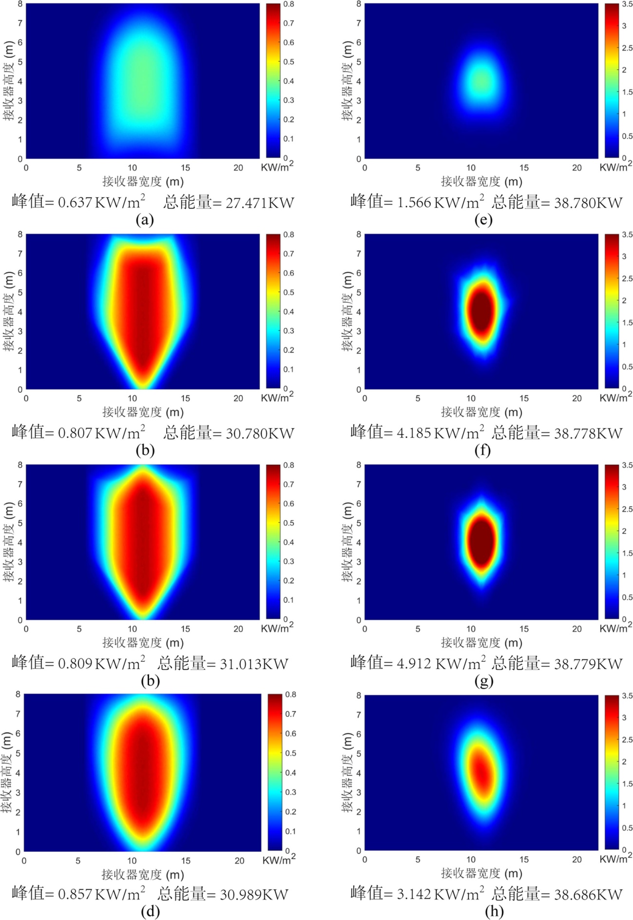 图10. 平面型定日镜(a)~(d)与抛物聚焦型定日镜(e)~(h)通量密度结果对比。图中各行自上而下依次代表矩形、五边形、六边形及八边形定日镜