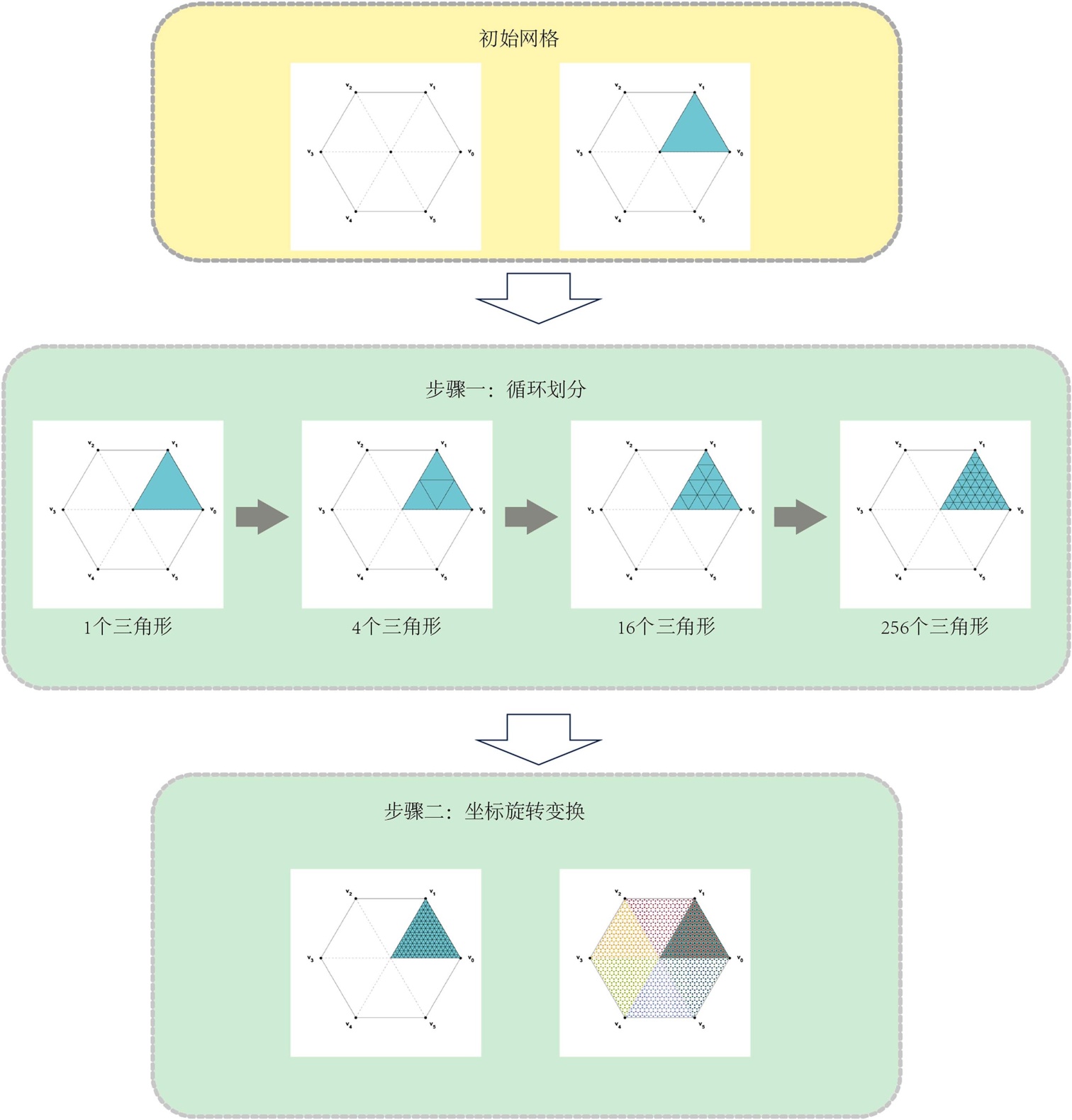 Loop自适应三角剖分算法可分为三个步骤。首先,初始化原始网格,选择其中一面三角形镜面作为划分的对象。如图3所示,在定日镜上将相邻的两个顶点与中心点相连,构建初始的三角形面片。随后,以该三角形为初始单元,进行多轮Loop三角剖分,直至网格划分精度满足预先设定的精度要求。随着细分迭代的不断进行,三角面片结构逐步细化,顶点数量持续增加,实现三角形镜面的精确刻画。最后,在完成三角网格细分后,充分利用规则多边形定日镜所具有的旋转对称性,对已细分三角形镜片进行坐标旋转变换,从而快速计算得到整个定日镜的微定日镜中心坐标,避免了大量的重复计算。