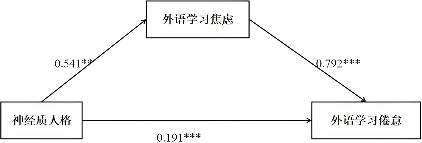 H2:外语学习焦虑在人格特质对外语学习倦怠的作用路径中具有传导效应,即个体的人格特征会通过焦虑程度这一中介变量,间接影响其外语学习倦怠。
