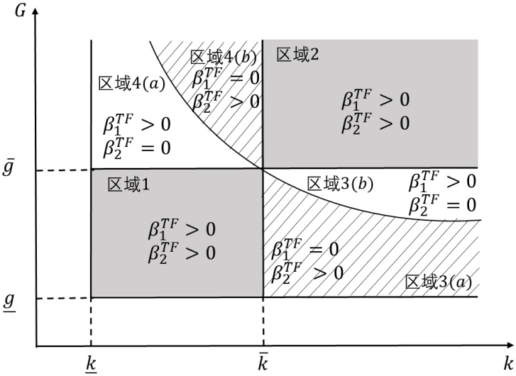 考虑到策略(T, F)下的均衡结果,本小节将区域3划分为区域3(a)和区域3(b)。在区域3(a)中,厂商2的绿色实践水平为0,在区域3(a)中,厂商1的绿色实践水平为0。本文用N表示设置厂商选择绿色实践水平为0的无作为策略。