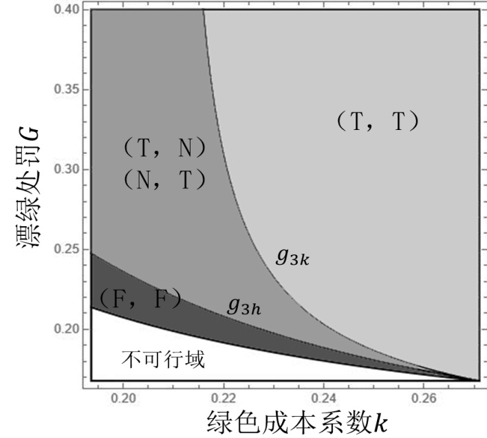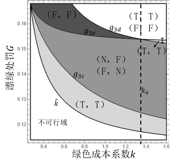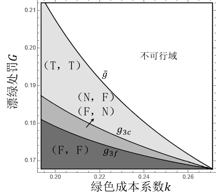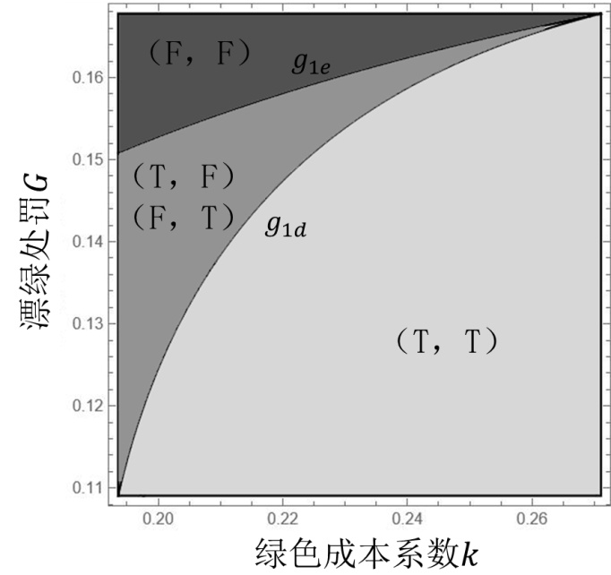 的情境,表明在策略(T,F)或(F,T)下,厂商有动机让绿色实践水平为零,这意味着厂商选择对绿色实践策略无作为,即不进行绿色实践。由于文章篇幅有限,相关阈值表达式可联系作者获得。