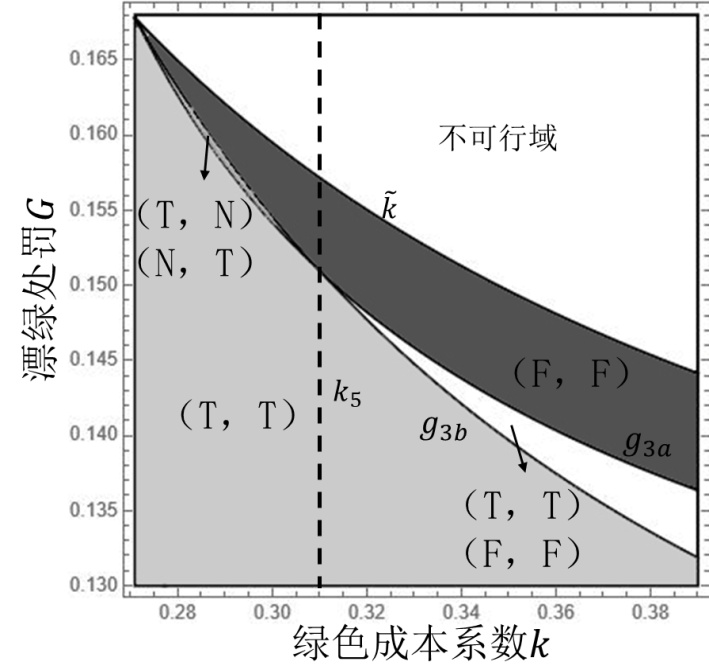 定理7展示了在区域3(a)中的厂商均衡策略。研究发现,当漂绿处罚相对较低时,(T, T)策略达到均衡;当漂绿处罚相对较高时,(F, F)策略达到均衡;当漂绿处罚相对适中且绿色成本相对较高时,(T, T)或(F, F)策略达到均衡,具体见图4。原因同区域1中的分析。注意到,当漂绿处罚相对适中且绿色成本相对较低时,(T, N)或(N, T)策略达到均衡。这是因为,在漂绿处罚相对适中时,随着绿色成本的降低,原本选择漂绿F策略的厂商会转向选择0绿色实践水平的无作为策略N。这一转变是因为随着绿色成本的降低,进行真实绿色实践的相对成本也降低,厂商发现采用无作为策略N能在获得一定市场认可和竞争