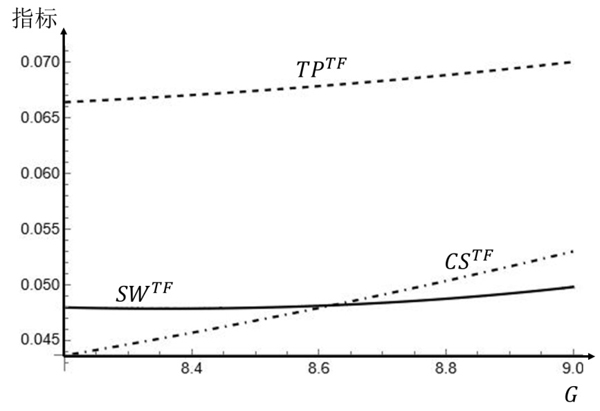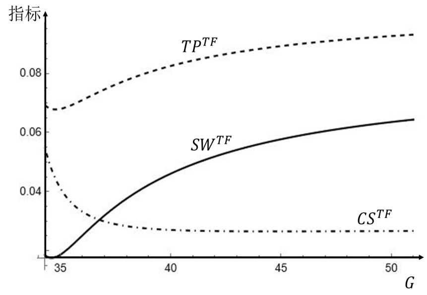 先减后增;在(T, F)策略的区域2下,供应链总利润、消费者剩余和社会福利关于