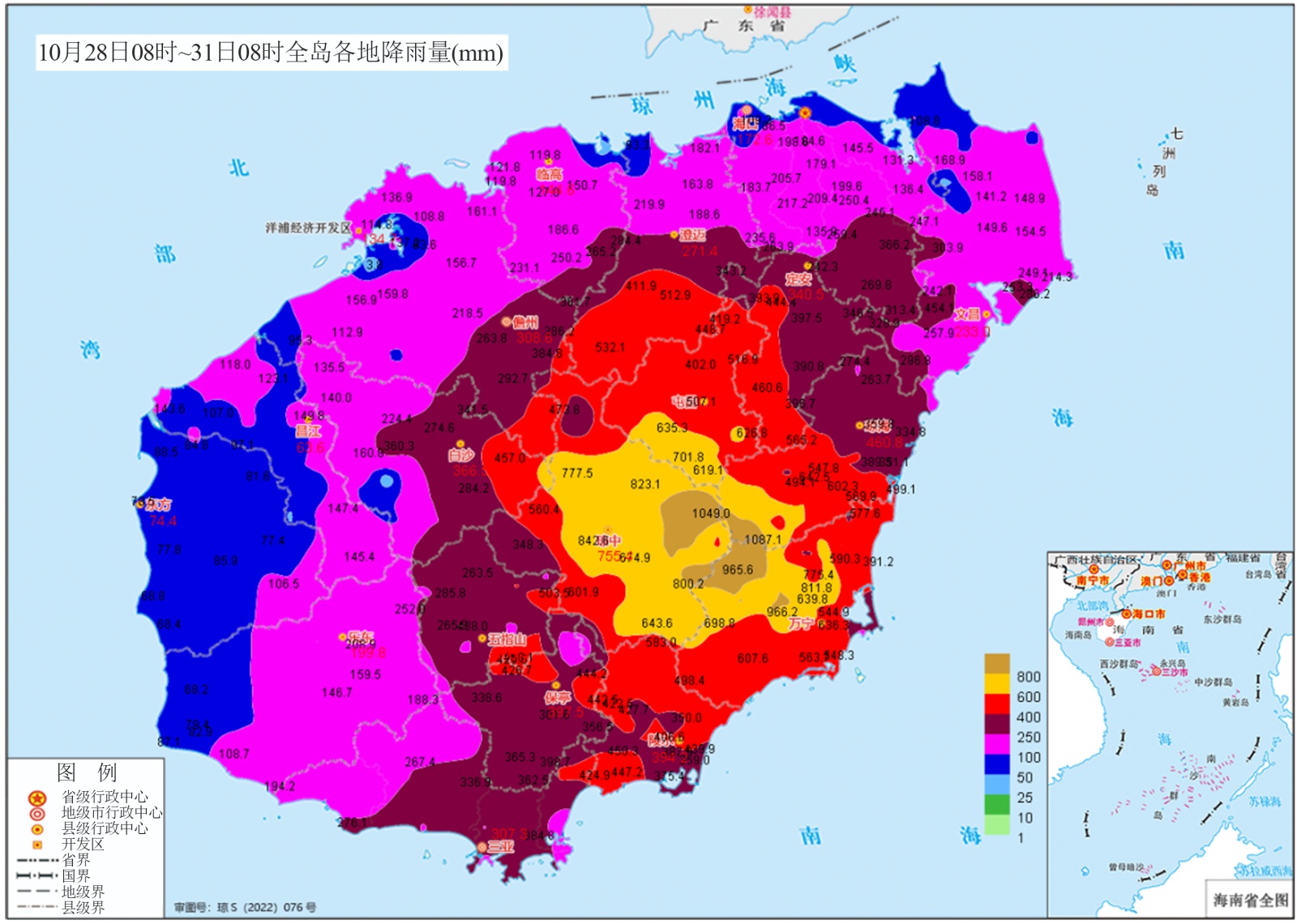 图1. 2024年10月28日08时-10日08时全岛雨量(单位:mm)