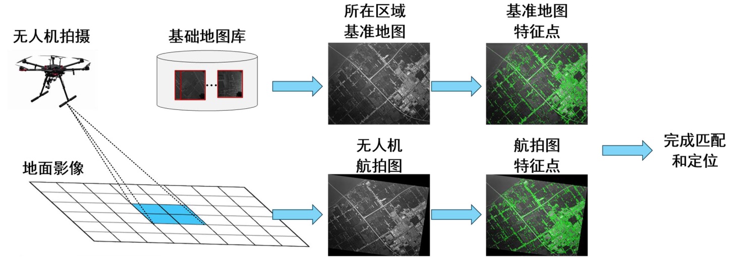 图1. 无人机航拍图与基准地图匹配示意图