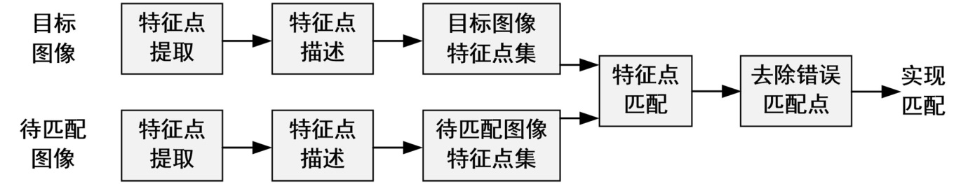 当前主流的匹配策略,是从图像中提取具备稳定性与可重复性的点特征来完成匹配过程。以点特征匹配为例,其图像匹配流程如图2所示,若能获取足量的正确对应点特征对,则可判定这两幅图像完成了有效匹配。