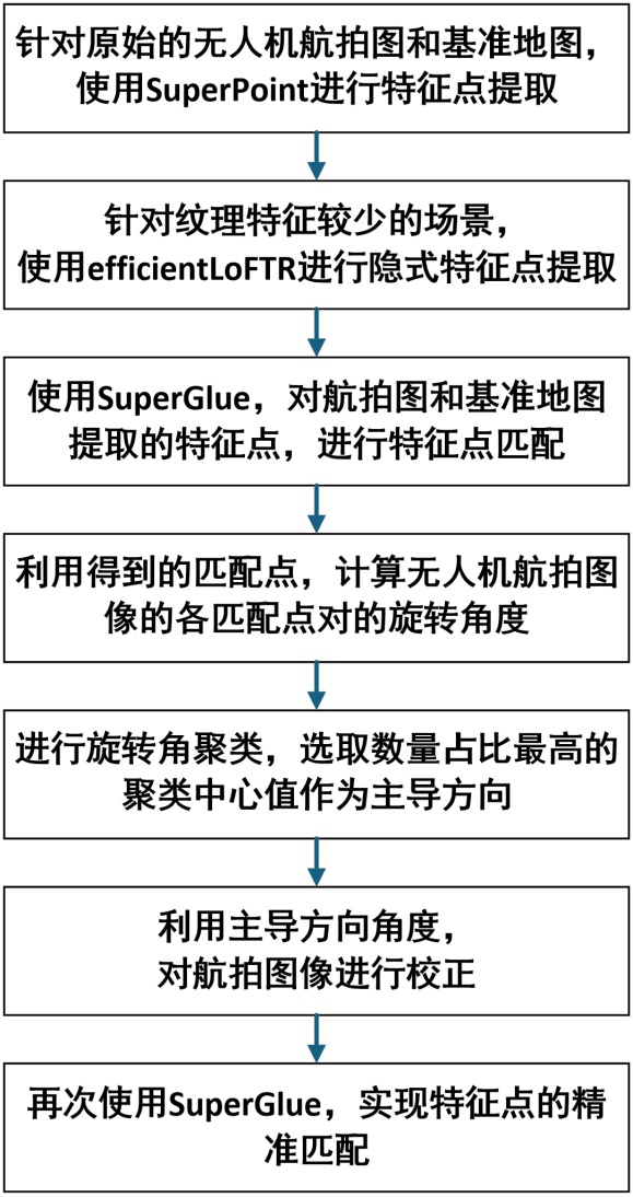 步骤7:精准特征点匹配。对重新调用SuperPoint模型,提取其特征点集,输入SuperGlue模型,重复特征匹配流程,输出消除旋转干扰后的精准特征匹配对集合。图3为算法流程图。