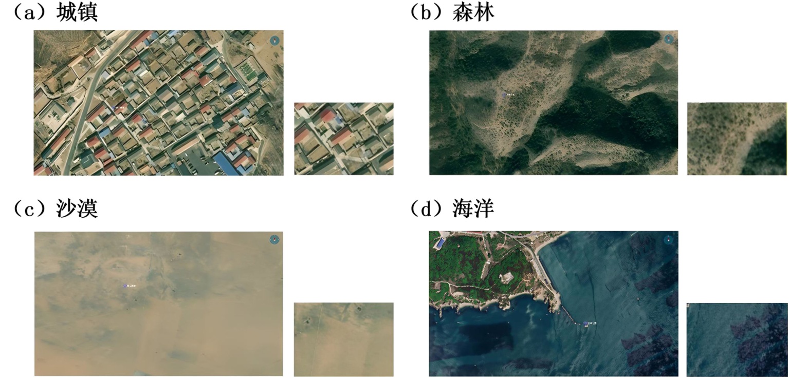 (1) 公开基准地图数据集:该数据集来源于谷歌地图公开数据源,通过专业地图提取工具获取,涵盖城市道路、沙漠地貌、海洋、港口等4种典型场景共1196张。数据集中的图像均经过预处理,可作为图像匹配任务中的基准参考图像,用于评估算法在标准场景下的匹配精度。