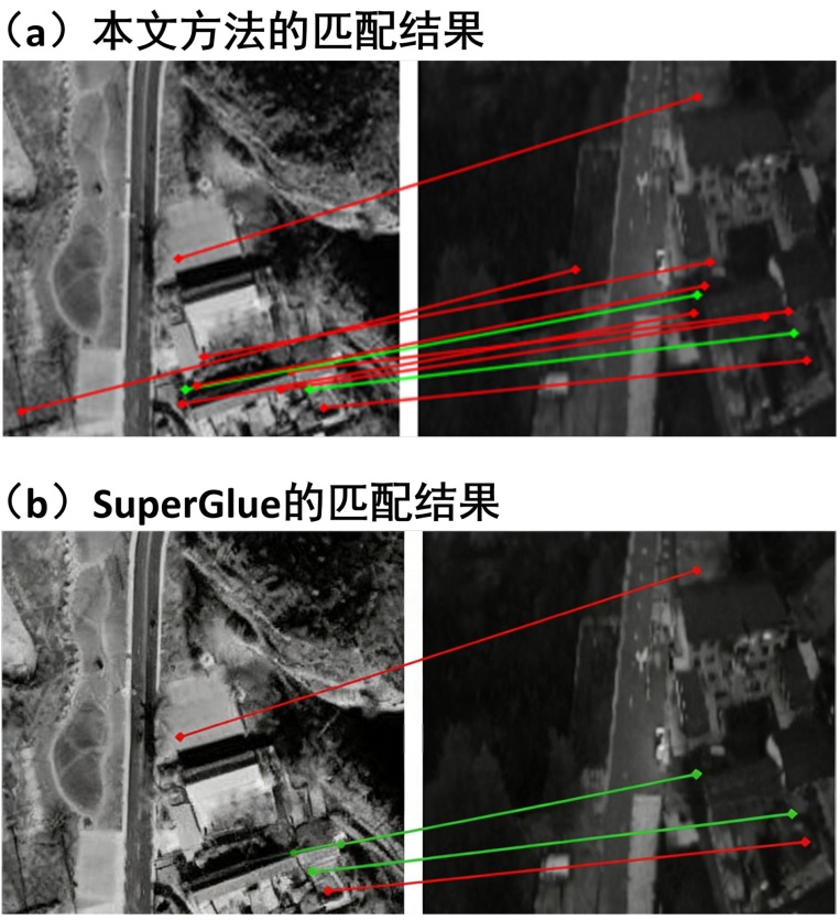 消融实验结果如图5所示,其中红线表示通过RANSAC的匹配点对连线,绿线表示未通过RANSAC的匹配点对连线。可以看到,本文方法的匹配连线数量更多,覆盖了重叠区域内的多数关键特征点,体现了更好的匹配召回率;而基线方法的有效匹配连线相对稀疏,部分核心特征点未形成正确匹配对,匹配覆盖度更低。