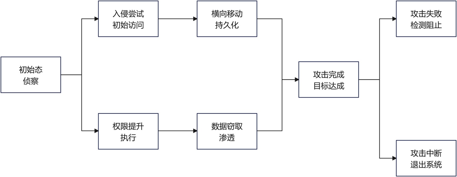 攻击场景建模是智能蜜罐体系构建的逻辑起点,其核心在于实现对真实攻击流程的结构化、抽象化与可控性建模,结合ATT&CK框架可将攻击链条划分为多阶段战术,每一战术由多个技术动作组成,可利用攻击行为矩阵构建攻击路径图,针对不同攻击者行为模式,基于图神经网络对历史攻击序列进行聚类分析,提取高频路径模式,建立状态转移图。假设攻击者状态为S = {s1, s2, ∙∙∙, sn},攻击行为为A = {a1, a2, ∙∙∙, am},则场景建模过程可抽象为有限状态机M = (S, A, T, s0, F),其中T为状态转移函数,s0为初始态,F为目标态集合[1]。通过拟合T函数可实现攻击路径的可控生成,最终形成贴近真实环境的行为诱捕场景。为清晰刻画攻击行为在不同阶段的演化关系,构建了攻击场景建模与状态转移结构,如图1所示。