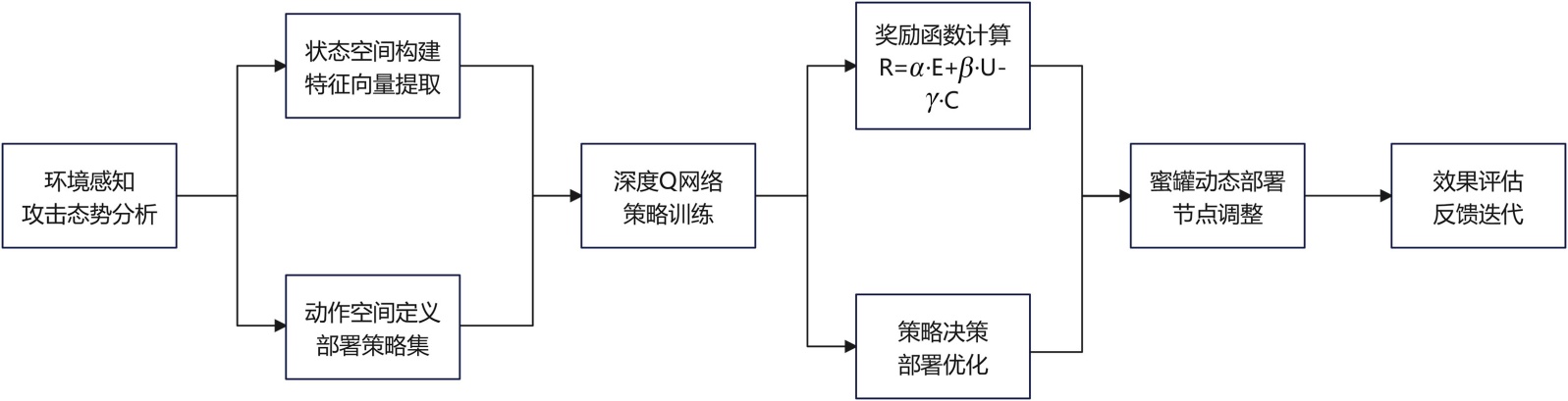 智能蜜网的部署策略直接影响诱捕效率与资源分配,需根据环境变化实现动态优化,在动态部署过程中,可采用强化学习模型对蜜罐节点进行策略决策,环境状态空间为当前攻击态势特征,动作空间为蜜罐节点的部署位置与类型调整,奖励函数设计需考虑攻击引诱成功率、资源利用率与检测能力,可设定为R = α∙E + β∙U − γ∙C,其中E为引诱效果,U为资源使用效率,C为部署成本,α、β、γ为权重参数。使用深度Q网络(DQN)进行策略训练,系统能够在攻击频次高或网络流量异常区域自动增设蜜罐节点,并在威胁消退后及时回收释放资源[3]。部署策略还需结合SDN与边缘节点能力,根据网络拓扑自适应调整诱捕范围,形成动态扩缩的蜜网边界。动态部署策略的整体优化流程如图2所示。