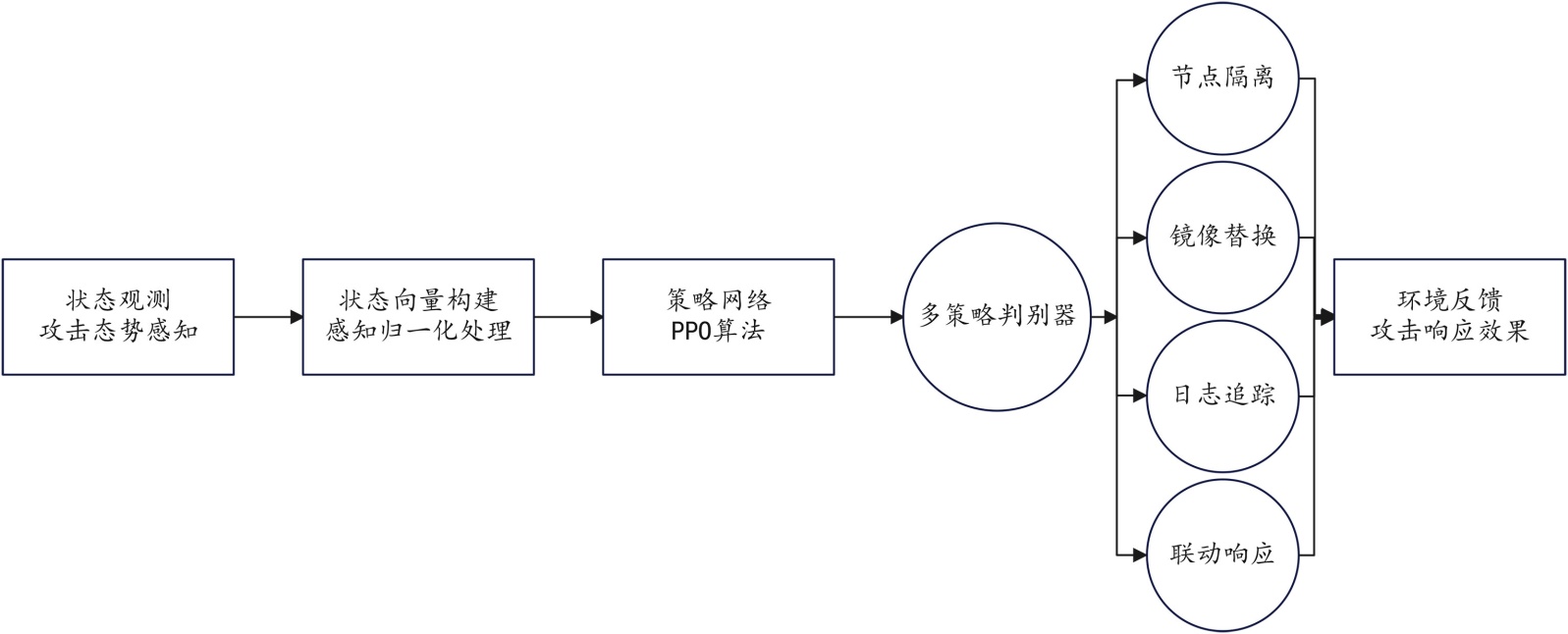 本文所提出的PPO-based自主响应策略与上述三种基准方法在相同攻击场景下进行对比,评估指标包括诱捕成功率、平均响应时延与资源利用效率。实验结果表明,PPO策略在策略稳定性与长期收益优化方面表现更优,其诱捕成功率由基于规则策略的64%提升至87%,且在高频攻击场景下未出现明显策略震荡,验证了该方法在动态攻防环境中的有效性[8]。