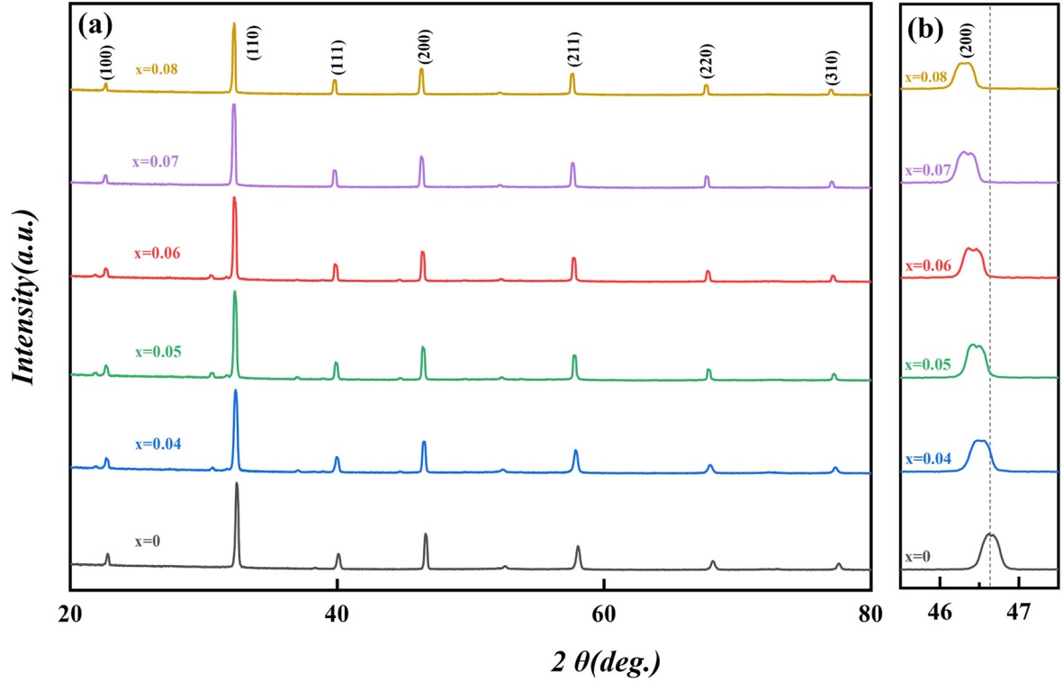 Figure 1. (a) X-ray diffraction patterns of BNT-xBT ceramics (x = 0~0.08) measured at room temperature; (b) Enlarged view of the (200) diffraction peaks