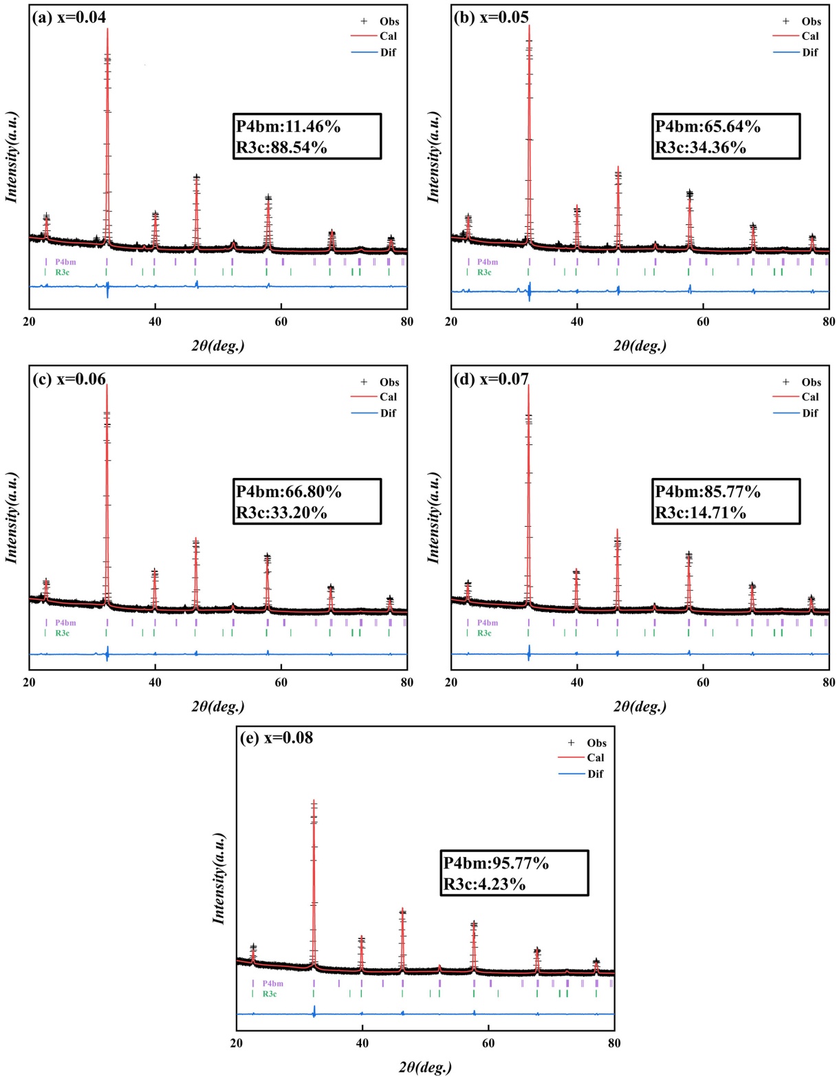 图2为BNT-xBT (x = 0.04~0.08)陶瓷的Rietveld精修图谱,纯相BNT在室温下是典型的三方相(R3c)相结构,纯相BT在室温下是四方相(P4bm)相结构,当体系中BT的含量不断增加,晶体结构会发生变化,结构会逐渐从R3c相转向P4bm相。在x = 0.04时,三方相占主导位置,R3c含量为88.54%;当x = 0.08时,四方相含量最高,P4bm含量已经高达95.77%;在0.06 ≤ x ≤ 0.07时,处于三方相和四方相共存状态,此时也是准同型相界区域,处在两种相之间的过渡区,由于这两种相的晶格结构存在一定的失配,导致晶体内部发生微小的结构畸变,这些畸变导致非对称的晶格,可以促进压电性能的增强。