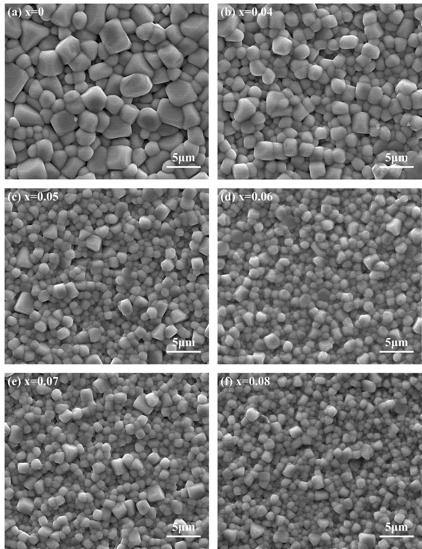 Figure 5. Scanning electron microscopy (SEM) images of BNT-xBT ceramics (x = 0~0.08)