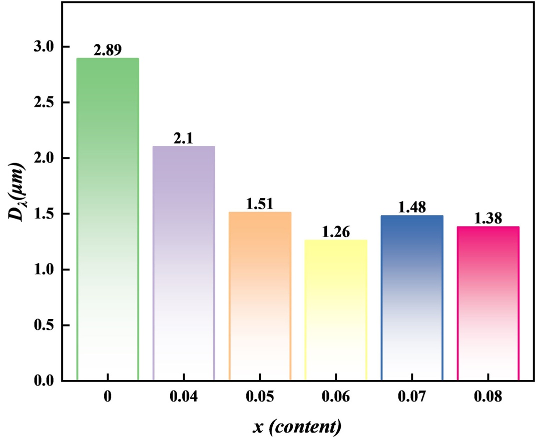 图3为BNT-xBT陶瓷样品在1150℃下保温180分钟烧结成型的表面微观形貌(SEM)图,表面未经过打磨处理,直接喷金进行扫描电镜拍摄。放大倍数均为10,000倍,标尺为5 μm。图4为BNT-xBT (x = 0~0.08)陶瓷平均晶粒尺寸对比图,数据通过Nano Measurer软件进行统计,采用的方法是线性截距法。从图3中可以看出,样品晶粒分布均匀,晶界清晰,没有观察到明显的孔洞,呈现高致密性。纯NBT的晶粒尺寸最大,平均晶粒尺寸为2.89 μm。BT的加入样品使陶瓷样品晶粒减小,在x = 0.06时,晶粒尺寸最小,Dλ = 1.26 μm。Ba2+离子促进晶格膨胀也增强晶界的稳定性,从而抑制了晶粒的生长,导致晶粒尺寸要比纯相BNT小。