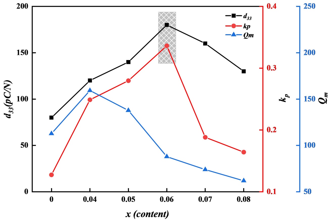 图5. BNT-xBT (x = 0~0.08)陶瓷常温压电常数d33、平面机电耦合系数kp和机械品质因数Qm的变化图