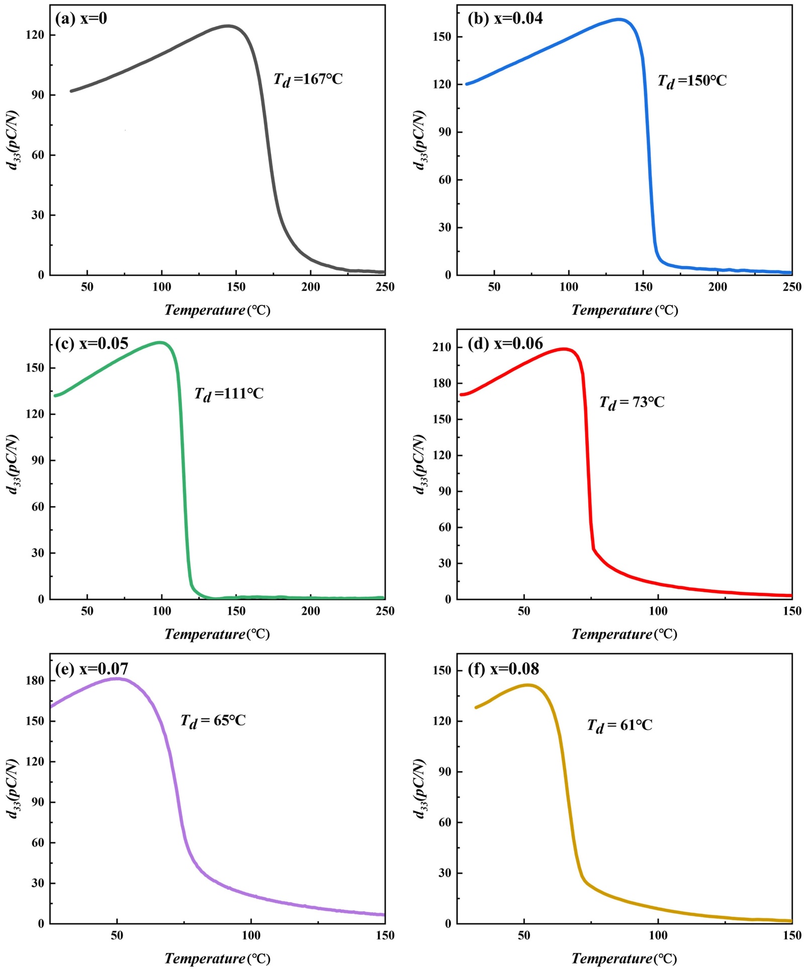 图6是BNT-xBT (x = 0~0.08)陶瓷压电常数d33随温度变化曲线,虽然Ba元素的加入可以使得压电性能变好,但是退极化温度Td也随之降低,导致热稳定性不好。本实验中纯相BNT的d33约为90 pC/N,退极化温度为167℃,BT的加入,陶瓷的晶格发生变化,改变整体晶格匹配条件,此现象在MPB附近很明显,当三方相和四方相共存,陶瓷在温度升高时更容易失去长程有序性。因此,BT的加入能够提高压电性能,但也带来了热稳定性下降的副作用,这在实际应用中需要权衡考虑,只适合室温条件下的应用,存在一定的局限性。