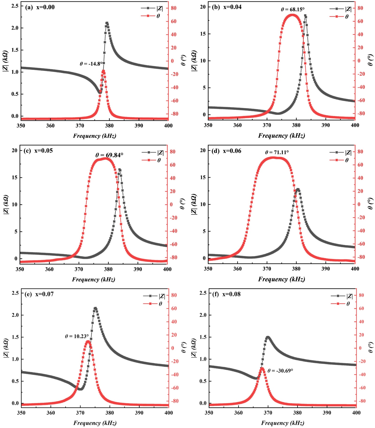 相位角是描述电信号与电流之间时间关系的重要参数,通常用于表征电压与电流波形之间的相对变化[12]。图7是BNT-xBT (x = 0~0.08)陶瓷的阻抗和相位角的变化曲线图,极化工艺均相同,可以看出,随着掺杂Ba元素含量的增加,阻抗角变化趋势为先增大后减小,在x = 0时,由于纯相BNT的极化难度较高,畴翻转难度高,因此在3.5 kV/mm的极化电场下,相位角仅−14.8˚;在x = 0.06时,相位角最大,θ = 71.11˚,说明在该比例下的陶瓷样品电畴排列有序性高,内部畴翻转更容易,能够有效地将将机械能和电能之间相互转换,极化难度降低;但随着比例增加,极化工艺不变,电场撤销之后,内部电畴稳定性差,很容易恢复原来状态,导致压电性能略有下降。