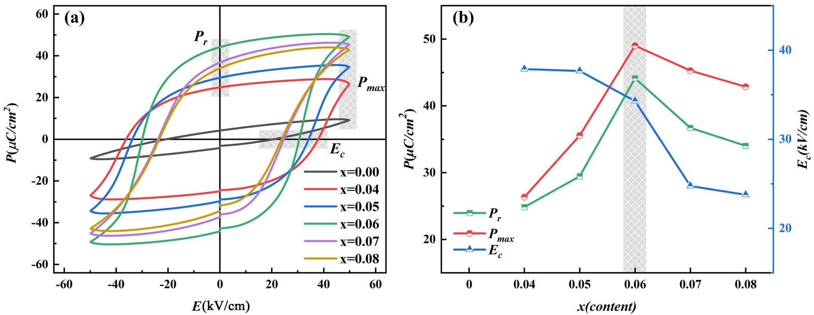 Figure 9. (a) P-E loops of BNT-xBT (x = 0~0.08) ceramics measured at 50 kV/cm; (b) Variation curves of Pr、Pmax, and Ec for BNT-xBT (x = 0.04~0.08) ceramics