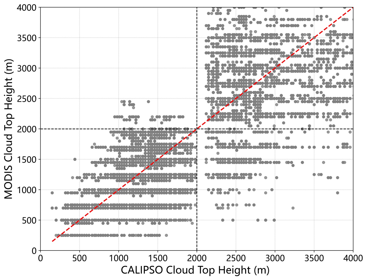 Figure 2. Comparison of cloud top height retrievals from CALIPSO VFM and MODIS MYD06