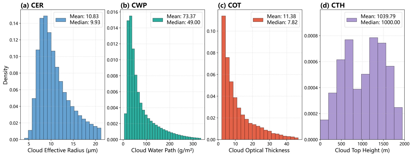 图3. (a) 云滴有效半径(CER),(b) 云水路径(CWP),(c) 云光学厚度(COT)和(d) 云顶高度(CTH)的核密度分布