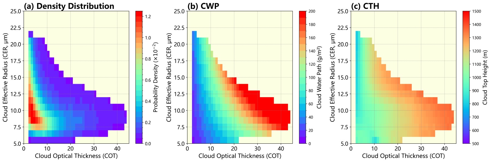 Figure 4. Statistical results of low cloud physical properties as functions of cloud optical thickness and cloud droplet effective radius, with shading representing: (a) probability density distribution, (b) cloud water path, and (c) cloud top height