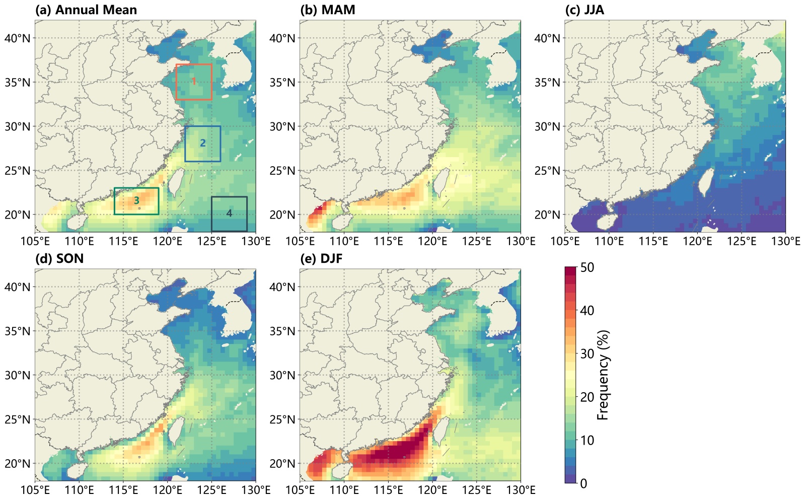 Figure 5. Spatial distribution of the daytime low cloud frequency over the China’s coastal seas from 2012 to 2022. (a) annual mean, (b) spring, (c) summer, (d) autumn, and (e) winter, spatial resolution: 0.5˚ × 0.5˚