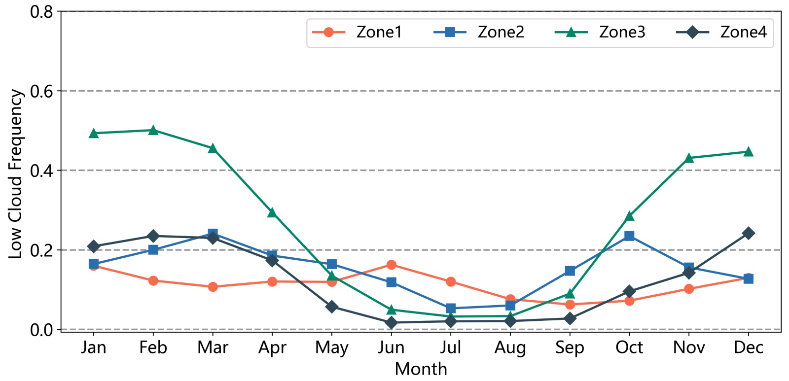 云频高值中心(CF > 30%)主要位于广东和福建沿海的南海北部海区,其次是台湾海峡附近海区。东海南部的低云云频(CF > 15%)略高于北部(CF < 15%),云频最低值出现在渤海(CF < 10%)。季节变化上,夏季低云云频最低(图5(c)),且主要集中在黄海海区,在低纬度海区云频较低。冬季低云云频达到最高(图5(e)),云频大值区分布与全年平均的分布格局相似。本文进一步选取了黄海(121˚E~125˚E, 33˚N~37˚N, Zone1)、东海(122˚E~126˚E, 26˚N~30˚N, Zone2)、南海北部(114˚E~119˚E, 20˚N~23˚N, Zone3)以及远离陆地的台湾岛东南部(125˚E~129˚E, 18˚N~22˚N, Zone4)海区,统计了各海区多年平均逐月低云云频(图6)。其中南海北部至台湾海峡一带(Zone3)的低云云频具有最明显的季节变率,其余海区云频的季节变化相对较小。除北部的黄海海区(Zone1)外,各海区的低云云频基本在夏季达到最低值,在冬季达到最高值。这与气象条件的季节变化有关,夏季较强的太阳辐射条件下大气层结更加不稳定,有利于对流的产生和云体垂直发展,使得云顶高度进一步上升[39],因此基于云顶高度统计的低云在夏季占比较少。而在冬季风控制下,低层大气稳定度高,且边界层存在逆温,有利于水汽在近海面积聚形成低层云或海雾[40],导致统计的低云云频较高。黄海海区低云云频的季节变化较小,在1月和6月具有两个云频峰值,其中6月的峰值主要由于夏季黄海盛行来自南方的暖湿季风气团,流经海温较低的黄海中部和北部海区时,气团底部由于冷却容易形成海雾和低层云[41]。