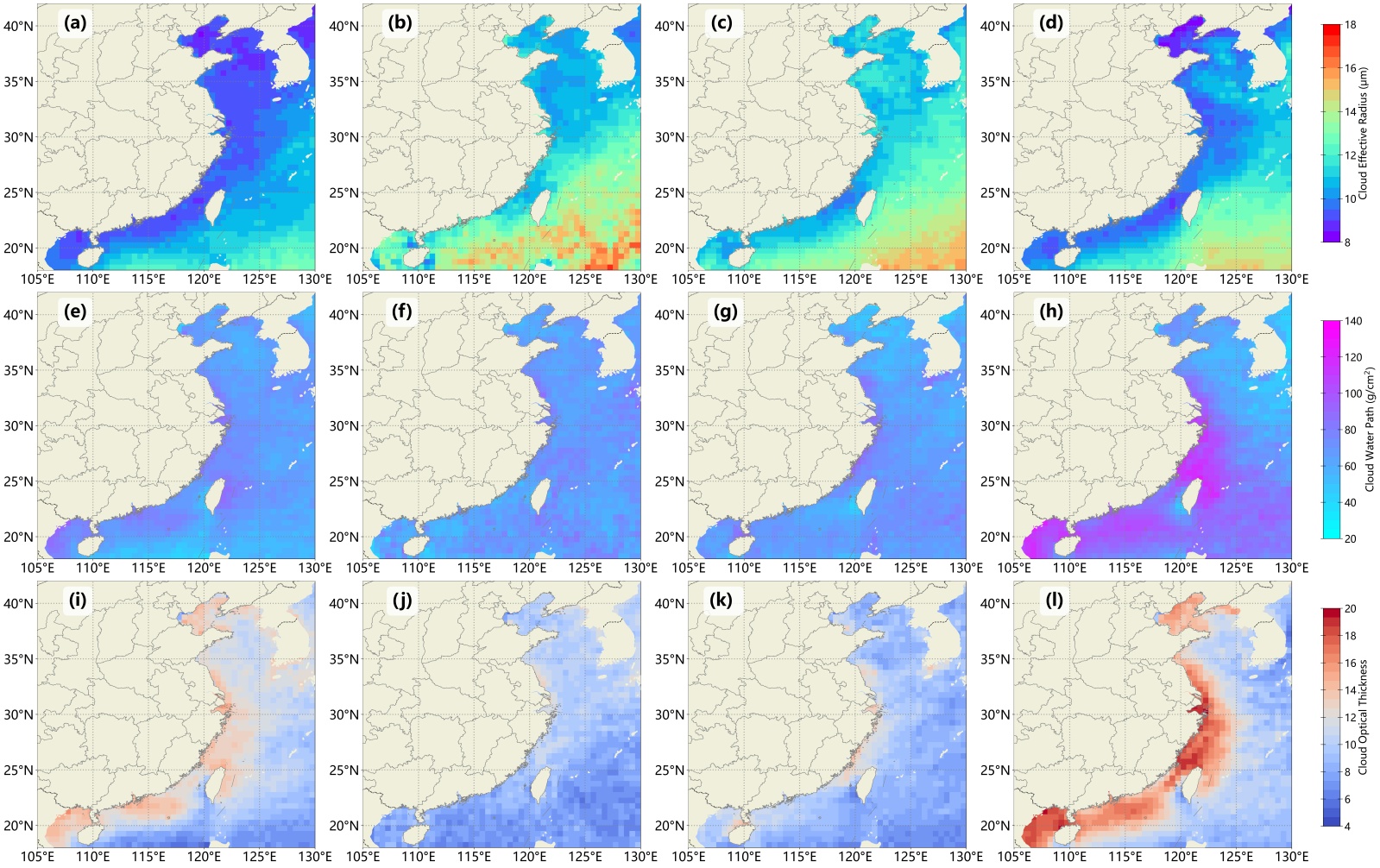 Figure 8. Seasonal distribution of daytime cloud physical properties over China’s coastal seas, (a)~(d) cloud effective particle radius, (e)~(h) cloud liquid water path, and (i)~(l) cloud optical thickness, spatial resolution: 0.5˚ × 0.5˚